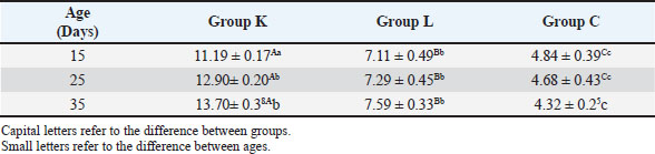 Statistical analysisThe GraphPad Prism software version 10.2.2 (San Diego, CA, United States) was used to statistically analyze the obtained data by Two-way ANOVA. Whenever ANOVA results were significant, post hoc analysis was performed using Tukey’s test. Number of animals represented by (n). Data are presented as mean ± standard error. Statistically significant was accepted when (p < 0.05) (Kim, 2014). Odds ratios were calculated using a free online calculator (MedCalc). Ethical approvalThe Experimental Design and Protocols used in the Current Study were reviewed and approved in accordance with the Animal Welfare Ethical. Measures by the Scientific Committee of the Department of Veterinary Microbiology, College of Veterinary Medicine, University of Baghdad, Baghdad, Iraq (p.o.3052024212). ResultsChIL4 levelsThe results demonstrated in Table 3 and Figure 1 indicated Group (K) had a gradual increase in ChIL-4 levels from 11.19 ± 0.17 on day 15 to 13.70 ± 0.38 on day 35. while group L exhibited a significant increase on day 15, this increase plateaued during subsequent observations, yet it still had higher levels than group C, which exhibited a significant decrease (p ˂ 0.05), with the lowest among the three groups being on day 35 at 4.32 ± 0.25. Molecular detectionGel electrophoresis showed bands of amplified DNA for the ChIL-4 gene as exhibited in Figure 2: SequencingSequence analysis indicated the presence of four genetic variants of the single-nucleotide polymorphism (SNPs) type (Fig. 3) within the area that was amplified. These variants were detected at locations 3044, 3132, 3261, and 3499 bp. Three of these are in the non-coding region, while site 3261 bp was in a coding region where in the instances where a homozygous mutant was demonstrated, the amino acid was changed from valine (Val) to isoleucine (Ile). Genotypically, Group K indicated the highest percentage of homozygous mutations at locations 3044, 3132, and 3261 bp. While Group L had the highest percentage of heterozygous mutations at locations 3044 and 3261 bp. The control group had the highest heterozygous mutant at 3132 bp and the highest homozygous wild at 3499 bp as shown in Table 4. The allele frequency in Group K had the highest percentage of mutant alleles at sites 3044 and 3132 bp. Group L had the highest percentage at site 3499 bp and the highest wild allele at site 3261 bp. The control group had the highest mutant allele at site 3261 bp and the highest wild allele at site 3132 bp which is demonstrated in Table 5. Sequencing results indicated that the alteration in the genotype in the first three locations (3044 A>G, 3132 G>A, 3261 G>A) occurred more likely in Group K compared with the other two groups, as shown in the odds ratio values in Table 4 this alteration in genotype resulted in an increase in the levels of Interleukin-4 that is produced. The last location (3499 G>A) indicated that the increase in Interleukin-4 happens more likely in group K than in group L (OR=0.843). The allele alteration at the first two locations (3044 A>G, 3132 G>A) highlighted similar results to the alteration in the genotype. Table 3. Mean ± S.E of ChIL4 titer of serum in ELISA test.