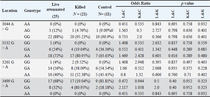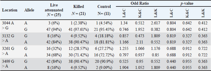 DiscussionVaccination and biosecurity are employed to manage the disease. Although immunization does not prevent the virus from replicating and shedding, it can protect against some clinical symptoms (Al-Zuhariy, 2023). The most widely used ND vaccines are live vaccination viruses developed with strains identified in the 1940s and 1960s. The LaSota, B1, and VG/GA vaccines were developed using viruses that existed in poultry. All of these types of viruses are genotype II and have a high genetic and antigenic similarity (>98% nucleotide identity). LaSota vaccines possessed the strongest tropism and replication capacity in naïve hens, leading to higher levels of neutralizing antibodies than other strains (Dimitrov et al., 2017). One limitation of inactivated ND vaccines lies in the fact that they require a withdrawal period before vaccinated birds may be processed for human food, and each vaccine must be administered individually via subcutaneous or intramuscular injection. Birds injected with inactivated vaccines have larger humoral antibody levels, but they do not generate a significant cell-mediated immune response (Schijns et al., 2013). This is exhibited in The ChIL-4 levels measured by sandwich ELISA, where group K scored the highest among the three groups. Dai et al. (2018) considered ChIL-4 to be a key biomarker of humoral immunity. Therefore, through measurement of its level using ELISA, it works as an indicator of the functionality of the Inactivated vaccine as demonstrated in the ELISA results of the three groups. None of the genetic variants that were detected were registered in the European variant archive suggesting that these mutations are novel, all though these changes have shown to be statistically non-significant. When comparing the ELISA results with the genetic variants that were detected, a possible link can be established between ChIL-4 levels and the mutation in the gene itself. Both the percentage of homozygous mutation in three of the four locations and ChIL-4 levels were the highest in Group K, this can be explained as the mutation resulting in the activation of ChIL-4. Thus, increasing the effectiveness of the vaccine. In a study done by Dang et al. (2020), it was found that the change from Val to Ile in anti-Müllerian hormone might not be an important influence on egg production. The Val and Ile diverge by only one methyl group. Without structural comparison, it would be very hard to recognize that this minor modification between two hydrophobic residues drastically altered a protein’s ligand preference (Yuan et al., 2010). Non-coding area mutations that disrupt non-coding components have been linked to severe disease, as confirmed by numerous methods. This includes influencing splicing, transcription, translation, RNA processing, stability, and chromatin interactions (Ellingford et al., 2022). In comparison, studies on genetic variation in combination with vaccines discuss their impact on the immune response and vaccine effectiveness. These alterations are shown to be of the SNPs type, which are genetic variations that can affect the function or structure of a protein (Abdullah and Abed, 2024). In a study done by Xie et al. (2016) on HBV vaccination, it was concluded that minor alleles found in non-coding regions had an impact on the immune response following the vaccination in humans. These findings align with (Wen et al., 2021) in their study on Influenza vaccination, which that demonstrated people with a mutant genotype had a significantly lower risk of poor vaccine responsiveness. A comparable conclusion was reached by Luo et al. (2022) in their investigation of novel Coronavirus mutation, stating that mutations in the S protein receptor binding domain of mutant strains can lead to immunological escape of the virus. Thus, impacting the effectiveness of the commercially available vaccines. In (Gao et al., 2024), an engineered vaccine with a mutation in the VP5 protein of Infectious bursal disease virus (IBDV) was found to reduce the mortality of host cells and limit IBDV proliferation early after infection, postponing cell death. These studies, in combination with the findings of this study, may suggest a profound effect on gene regulation and immune responses. This underscores the necessity for additional research into the impact of genetic variations on vaccine efficacy in chickens. Integrating genomic data with vaccine strategies could lead to the development of more effective, targeted vaccines that account for both humoral and cell-mediated immune responses. These strategies might assist in overcoming present obstacles, such as the requirement for customized inactivated vaccine administration, while simultaneously tackling the problem presented by new NDV variations. ConclusionIn conclusion, there is a noticeable effect caused by genotyping and allele variations on ChIL4 activation, which is more obvious with inactivated vaccination than with live attenuated vaccine, and even less so with non-vaccinated chickens. AcknowledgmentsNone. Conflict of interestThe authors declare no conflict of interest. FundingNone. Authors’ contributionsContributions from each author were equal. ReferencesAbdullah, W.L. and Abed, R.M. 2024. Gene expression and single nucleotide polymorphism (rs1140713) of microRNA-126. Iraqi J. Agric. Sci. 55(Special), 1–11; doi:10.36103/ijas.v55iSpecial.1880 Ahmed, A.I. and Odisho, S.M. 2018. Isolation identification and pathotyping of newcastle disease viruses form naturally infected chickens in Iraqi Kurdistan region. Iraqi J. Agric. Sci. 49(1), 132–141; doi:10.36103/ijas.v49i1.216 Ahmed, A.I., Odisho, S.M. and Al-Gafari, R.N. 2018. Comparison of the immune response between locally manufactured and commercial inactivated newcastle disease virus vaccines in a challenge trial with field isolated newcastle disease virus. Iraqi J. Vet. Med. 42(1), 46–51; doi:10.30539/iraqijvm.v42i1.30 Al-Amri, S.A.H., Odisho, S.M. and Ibrahem, O.M