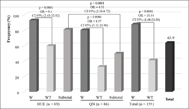 The present study found an estimated prevalence of S. aureus of 63.9% in swine farms. Studies conducted by Linhares et al. (2015) and Sun et al. (2015) reported a higher prevalence of S. aureus isolated from swine farms (77.0% and 91.1%, respectively) than that reported in the present study. The prevalence of S. aureus strains similar to those found in this study (63.6% and 68.6%) (Nobre et al., 2021; Sineke et al., 2021) or even lower (36.2%) (Zehra et al., 2017). Staphylococcus aureus can be endemic in swine populations, and its relative prevalence varies geographically and probably temporally (Espinosa-Gongora et al., 2014). A study in Bac Ninh province, North Vietnam, found a lower prevalence of S. aureus strains in nasal swab samples of swine (13/80, 16.25%) (Vu et al., 2020) than observed in this study. In the present study, a significant difference in the prevalence of S. aureus strains was observed between QN (43/86, 50.0%) and HUE (56/69, 81.2%), with a p-value 0.05. The emergence of AMR in S. aureus represents a major challenge to animal and public health. Poor biosecurity practices and the use, misuse, and overuse of veterinary drugs in farming settings may apply environmental pressure, which favors the selection of AMR bacteria (Vestergaard et al., 2019; Urban-Chmiel et al., 2022). S. aureus is the most commonly identified AMR pathogen worldwide (Foster, 2017). It is resistant to almost all β-lactams and other major AM classes, such as fluoroquinolones (Monaco et al., 2017; Kumar et al., 2020). In this study, high resistance rates were obtained for OX, CTX (each 59.6%), and LNZ (53.5%), corroborating the findings of other studies (Nguyen et al., 2014; Guo et al., 2018; Lekagul et al., 2019; Vu et al., 2020). These AMs are frequently used in swine farming to treat diseases, and the capacity of S. aureus to acquire resistance to these drugs has already been demonstrated (Duong and Nguyen, 2015; Nhung et al., 2016; Luu et al., 2021). In addition, high frequencies of strains resistant to OTC (44.4%), AMP, DOX (each 42.4%), and CFL (35.4%) were also observed, corroborating the results of other studies (Nhung et al., 2016; Vu et al., 2020; Sineke et al., 2021). These results are worrisome because these AMs belong to classes with the highest priority among those critically important for human medicine and should be used prudently in both humans and animals (Collignon et al., 2016). MDR S. aureus strains from swine may play an important role in spreading AMR strains and ARGs among animals, humans with direct animal contact, or even pork consumers, thereby impacting the treatment of possible infections. In this study, MDR, defined as the resistance to two or more AMs, was found in 81 (81.8%) S. aureus strains. This was observed mainly on farms that used a wide variety of AMs for purposes other than treatment. Many strains showed resistance to up to 10 AMs. As in other reports, AMs are commonly used on swine farms, with usage frequency varying according to the geographic region (Foster, 2017; Abreu et al., 2019; Adesoji et al., 2019). Most of the farms where MDR S. aureus was isolated carried out disinfection of pens, used at least three AMs, and used AMs for purposes other than treatment. The broader use of AMs is expected to be associated with greater MDR colonization in swine. The use of disinfectants and downtime are biosecurity practices adopted to reduce the introduction and dissemination of infectious agents among animals. Nevertheless, disinfectant resistance may contribute to the selection of MDR bacteria, especially when the responsible genes are co-located with ARGs in mobile genetic elements (Davies & Wales, 2019; Maertens et al., 2019; Bischofberger et al., 2020). The high MDR rate highlights the need for AM stewardship to ensure prudent AMU in animal production, as it may have serious consequences for human and environmental health. Vaccination is a highly effective and valuable tool for fighting AMR. However, the present study found a significantly lower rate of S. aureus strain resistance to MEM (8.1%), ENR (21.0%), and STR (12.9%) in the vaccinated group compared with the non-vaccinated group (29.7%, 40.5%, and 43.2%, respectively). Moreover, a negative association between vaccination and AMR in S. aureus strains [resistance to MEM (OR=0.21; p=0.006), ENR (OR=0.39, p=0.04), and STR (OR=0.2, p=0.001)] was observed (Table 4). The association between vaccination and AMU/AMR has been reported (Bak and Rathkjen, 2009; Kruse et al., 2016; Temtem et al., 2016; Peiponen et al., 2018; Buchy et al., 2020; Costanzo and Roviello, 2023). Bak and Rathkjen (2009) found significantly lower AMU in the group vaccinated against Lawsonia intracellularis (LAW) than in the non-vaccinated group. However, Peiponen et al. (2018) found only a slightly, but not statistically significant, lower AMU in the group vaccinated against LAW. The associations between vaccination and AMU have also been studied at the population level, with varying results. A cross-sectional study by Temtem et al. (2016) found that herds vaccinated against Porcine Circovirus Type 2 (PCV2), Mycoplasma hyopneumoniae (MYC), and/or LAW had significantly higher AMU in weaners than herds not vaccinated against any of these infections. Similarly, Postma et al. (2016) found that the use of vaccines against higher numbers of pathogens was associated with a higher AMU in swine from birth to slaughter. Kruse et al. (2016) reported that initiating vaccination against PCV2, MYC, Actinobacillus pleuropneumoniae, PRRS, and LAW had no effect on the change in AMU in weaners and finishers. Obolski et al. (2018) found that vaccination can result in a rapid increase in the frequency of preexisting resistant variants of non-vaccine serotypes due to the removal of competition from vaccine serotypes. Similarly, the results of this study show that among the vaccines used (Table 1), none is used to prevent diseases related to S. aureus infection.