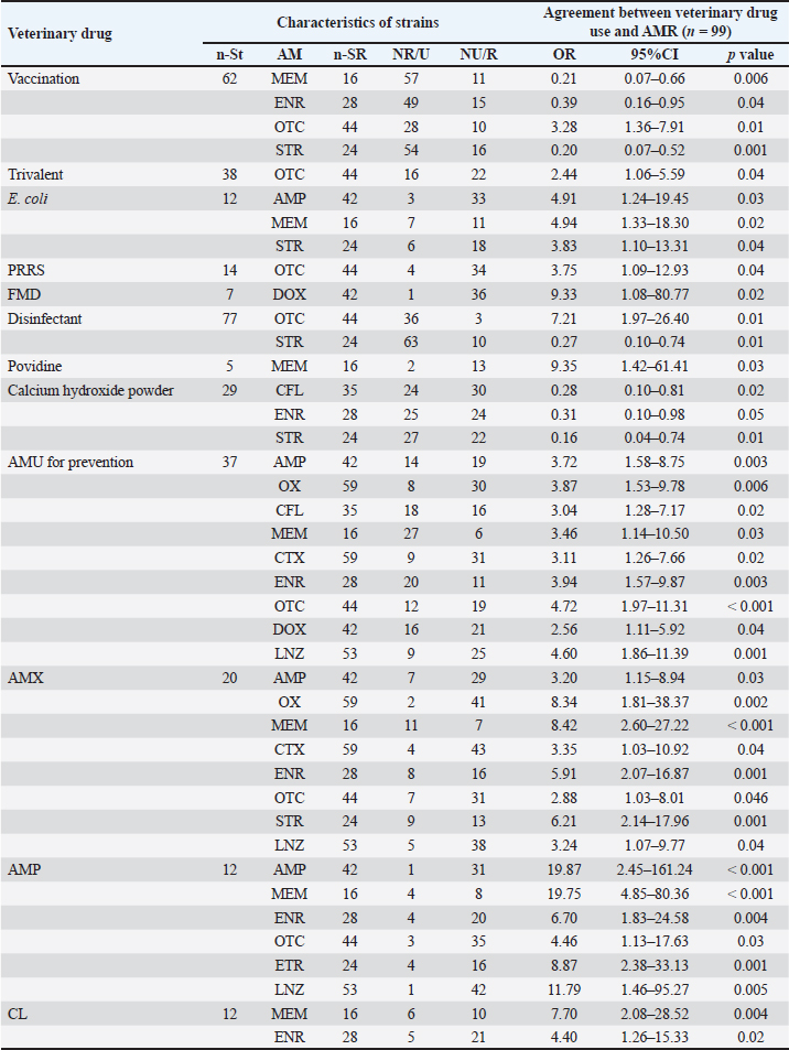 Antimicrobial use is generally accepted as the main driver of AMR, and the relationship between AMU and AMR in animals is, therefore, a topic of considerable interest (Holmer et al., 2019; Jibril et al., 2021; Sali et al., 2021). Our investigation revealed significant associations between AMU (in both prevention and treatment) and the presence of certain AMR phenotypes. The AMR phenotype is common among E. coli indicators isolated from swine in the United States (Spronk et al., 2023) and European countries (EFSA, 2021). Similar to the findings of Kobayashi et al. (2023), the results of this study showed that AMU was associated with resistance not only to AMs belonging to the same AM class (AMX and AMP; GEN and STR) but also to AMs from other classes (AMX and ENR; FLO and DOX). Resistance genes occurring in the same mobile genetic elements and gene cassettes (Birkegård et al., 2017; Partridge et al., 2018) may explain the observed AMR phenotypes and should be addressed in more detail in future investigations. However, not all associations between AMU and AMR phenotypes in this study could be explained. For example, the use of LNZ, STR, and NOR (as treatment) was negatively associated with the presence of the OTC phenotype. In other studies, both corresponding and divergent associations between AMU and AMR, including direct and implicit resistance selection mechanisms, have been reported (Callens et al., 2015; Makita et al., 2016). Makita et al. (2016) suggested that these issues were due to natural, cross- or co-selection based on analyses of AMR in E. coli isolates from swine and AMU. ConclusionSmallholder swine farmers in the two provinces used several essential veterinary drugs (including disinfectants, vaccines, and AMs) on their farms for prevention and treatment. The S. aureus isolates from swine included those from healthy swine that threatened public and animal health. Resistance to some AMs in S. aureus isolates was associated with the use of vaccines, disinfectants, and corresponding AMs, implying that increasing the use of such AMs would increase resistance. These results should help establish countermeasures against AMR in S aureus in smallholder swine farms in Central Vietnam. The findings provide support only for analyses conducted at a single time point: on-farm veterinary drug usage is associated with on-farm AMR. Other complex multifactorial relationships may contribute to the selection of AMR bacteria, which we hope to investigate further in future studies. AcknowledgmentThe authors would like to thank Mr. Hoang Dinh Quoc, who helped us with sampling. We also thank the farmers in Quang Ngai and Hue provinces, who participated in the interviews, provided honest information, and allowed sampling from their pigs. Conflict of interestThe authors declare that they have no conflicts of interest regarding any financial, personal, or other relationships with individuals or organizations related to the material discussed in this manuscript. FundingThis work was supported by a Hue University-level research project (No. DHH2023-02-176. The authors are grateful to the president of Hue University for allowing them to conduct this study. Authors’ contributionsAll authors contributed to the study’s conception and design. Nguyen Van Chao developed the original hypotheses, designed the experiments, and collaborated in interpreting the results. Ho Thi Dung, Bui Thi Hien, and Vu Thi Thanh Tam collected the data for this study, conducted the statistical analyses, and collaborated in the interpretation of the results. Ho Thi Dung, Vu Thi Thanh Tam, Phan Thi Hang, and Bui Thi Hien collaborated in interpreting the results and finalized the manuscript. All authors have read and approved the finalized manuscript. Data availabilityData supporting the findings of this study are available from the corresponding author under the Project funding, upon reasonable request. ReferencesAbreu, R., Rodríguez-Álvarez, C., Lecuona, M., Castro, B., González, J.C., Aguirre-Jaime, A. and Arias, Á. 2019. Increased antimicrobial resistance of MRSA strains isolated from pigs in Spain between 2009 and 2018. Vet. Sci. 6(2), 38. Adesoji, A.T., Onuh, J.P., Bagu, J. and Itohan, S.A. 2019. Prevalence and antibiogram study of Staphylococcus aureus isolated from clinical and selected drinking water of Dutsin-Ma, Katsina state, Nigeria. Afr. Health Sci. 19(1), 1385–1392. Asai, T., Kojima, A., Harada, K., Ishihara, K., Takahashi, T. and Tamura, Y. 2005. Correlation between the usage volume of veterinary therapeutic antimicrobials and resistance in Escherichia coli isolated from the feces of food-producing animals in Japan. Jpn. J. Infect. Dis. 58(6), 369–372. Auplish, A., Vu, T.T.T., Pham Duc, P., Green, A., Tiwari, H., Housen, T., Stevenson, M.A. and Dhand, N. 2024. Capacity and needs assessment of veterinary services in Vietnam in biosecurity, biosafety and One Health. PLoS One 19(1), e0295898. Bak, H. and Rathkjen, P.H. 2009. Reduced use of antimicrobials after vaccination of pigs against porcine proliferative enteropathy in a Danish SPF herd. Acta Vet. Scand. 51(1), 1. Basiry, D., Entezari Heravi, N., Uluseker, C., Kaster, K.M., Kommedal, R. and Pala-Ozkok, I. 2022. The effect of disinfectants and antiseptics on co- and cross-selection of resistance to antibiotics in aquatic environments and wastewater treatment plants. Front Microbiol 13(1), 1. Birkegård, A.C., Halasa, T., Græsbøll, K., Clasen, J., Folkesson, A. and Toft, N. 2017. Association between selected antimicrobial resistance genes and antimicrobial exposure in Danish pig farms. Sci. Rep. 7(1), 9683. Bischofberger, A.M., Baumgartner, M., Pfrunder-Cardozo, K.R., Allen, R.C. and Hall, A.R. 2020. Associations between sensitivity to antibiotics, disinfectants and heavy metals in natural, clinical and laboratory isolates of Escherichia coli. Environ. Microbiol. 22(7), 2664–2679. Blanco, P., Hernando-Amado, S., Reales-Calderon, J.A., Corona, F., Lira