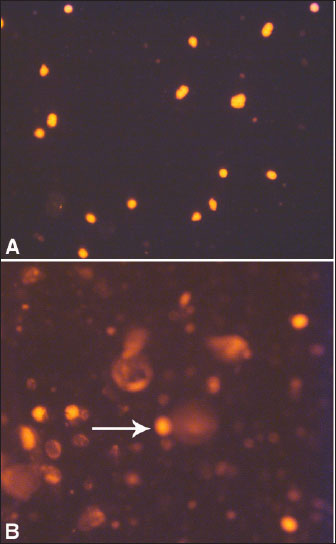 Fig. 1. Representative comet images of hepatocytes in a dairy cow with FL. In control cow (A), DNA is tightly compressed and the circular disposition of the normal nucleus is maintained. Bobe-damaged DNA in the diseased cow (B) migrates from the core toward the anode, forming the tail of a comet (arrow). Ketotic cows also exhibit decreased DMI, reduced milk production, reduced milk fat, and alterations in lipid and carbohydrate metabolism compared with healthy cows. Immediately before the onset of ketosis, serum lactate and interleukin-6 (IL-6) are the most common biomarkers between ketotic animals and healthy animals, thus making these biomarkers as predictors for the disease in suspected animals (Zhang et al., 2016). Acetonemia is principally detected depending on the levels of ketones in the milk, blood, or urine. Although these tests are rapid and extensively validated, their long-term effectiveness has not been evaluated (Serrenho et al., 2022). In the primary type of ketosis, animals show a gradual reduction in appetite and milk production for a period of 3–4 days with a moderate loss of body condition and depression (Fig. 3). In the nervous system, nervous symptoms include hyperesthesia, depraved appetite, head-pressing, bellowing, walking in circles, compulsive chewing and licking, and blindness (Constable et al., 2017).