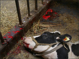 Fig. 4. Bilateral nasal bleeding and hemoptysis of fresh arterial blood leading to sudden death in a cow with caudal vena cava thrombosis.