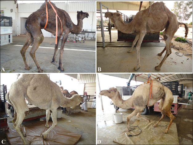 Fig. 8. Clinical presentation of four downer camels that admitted for examination in a setting position. During lifting by a winch, camels were classified as having mild (A), moderate (B), severe (C), and advanced (D) degrees of inability to stand.