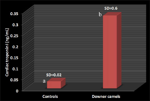 Fig. 11. Cardiac troponin I values in downer camels compared with control healthy camels. a,b different letters indicate a significant difference (p=0.019). SD=standard deviation.