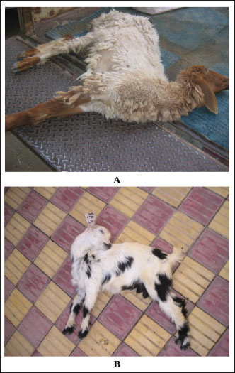 Fig. 13. Hypomagnesemic tetany in one sheep and three goats from the core toward the anode, forming the tail of a comet (B). The primary clinical signs of hypomagnesemia include incoordination, hyperexcitability, and nervous seizures. The animals are observed grazing and abruptly adopting an abnormal posture and appear restless with following facial muscle spasms, hyperesthesia, tetany at the base of the ears, aggressiveness, spasticity, erected ears, and raised head. The signs quickly progress to tonic-colonic convulsions with prolonged relaxation. During seizure episodes, it is common to observe jaw chewing locomotion with grinding of the teeth, mouth, and nose foaming, opisthotonus, exaggerated movements of the eyeballs, and violent pedaling movements (Fig. 13). The animal may enter a coma between 6 and 10 hours after the primary clinical signs and eventually collapse (Dewell and Ensley, 2016). In subclinical types, most herds are affected even if severe cases have not been detected. The signs in calves with milk tetany are more intense than those in cows with subacute, acute, and per acute cases (Constable et al., 2017). MastitisAnimals with elevated milk yield are at high risk of mastitis (Ranjan et al., 2021). Mastitis primarily occurs in response to intramammary bacterial invasion, but also to intramammary fungal, mycoplasmal, and algal infections. Thermal and mechanical trauma and chemical insult may predispose the mammary gland to infection. The prevalence of disease in dairy cattle is comparatively high. Acute mastitis in bovines involves a primary phase that includes an inflammatory response followed by a resolution stage (Tharwat, 2011; Tharwat and Selim, 2015). In industrialized countries, clinical mastitis (CM) is the most common and costly disease. Progressive and moderate CMs always require antibiotic treatment and should be managed with consideration of animal well-being (Constable et al., 2017). The subclinical form of mastitis is the principal type in intensive dairy herds, reaching 20%–50% of dairy cows in a given herd (El-Zamkan and Mohamed, 2021; Alhafiz et al., 2022). Staphylococcus aureus and E. coli are the most serious pathogens causing mastitis in dairy animals (Abril et al., 2020; Ranjan et al., 2021). Tearing of the suspensory ligaments occurs commonly in adult dairy cows and evolves progressively over several years. The initial etiology is thought to be intense mammary edema at parturition, with severe weight on the udder leading to the breakdown of the mammary attachments, especially the median suspensory ligament. Thus, the teats on diseased cows are not perpendicularly aligned but present more laterally (Tharwat and Selim, 2015). When the tear of the suspensory ligament occurs in an acute manner, immediately before or after calving, the mammary gland drops sharply and is hard and swollen, the teats are directed laterally, and serum is discharged through the skin (Fig. 14). Pregnancy toxemiaPT is a metabolic disease of pregnant ewes and does, initiated by an altered metabolism of carbohydrates as well as fats, and is observed during the last phase of pregnancy (Tharwat and Al-Sobayil, 2014; Weaver et al., 2021; Tharwat et al., 2025). The disease has a higher incidence rate in those carrying more than one fetus, and it occurs more frequently in lean ewes than in those with a body condition score (BCS) of less than 2 or in obese animals with a BCS of 4 or over. Clinically, cases are typically limited to older female sheep and goats during second or subsequent pregnancies. In susceptible animals, PT generally follows a period of NEB that results in increased fat catabolism, hypoglycemia, ketonuria, and ketonemia (Rook, 2000; Scott, 2020). The disease manifests clinically as hypoglycemic encephalopathy. Affected animals show depression, anorexia, blindness, and neurological signs, followed by recumbency and coma (Menzies and Bailey, 1997). Laboratory findings of hypoketonemia/hyperketonuria and hypoglycemia (Brozos et al., 2011). Thus, increased serum ketone body concentrations and NEFA are associated with the disease, but the clinical signs are not apparent unless hypoglycemia is evident (Tharwat et al., 2025).