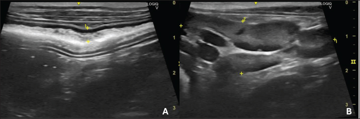 Fig. 1. B-mode ultrasound of a dog with intestinal lymphangiectasia. A: Duodenum with hyperechogenic mucosa at the dorsal and ventral margins. B-Jejunal lymph node with regular margins, homogeneous echotexture, and preserved echogenicity.