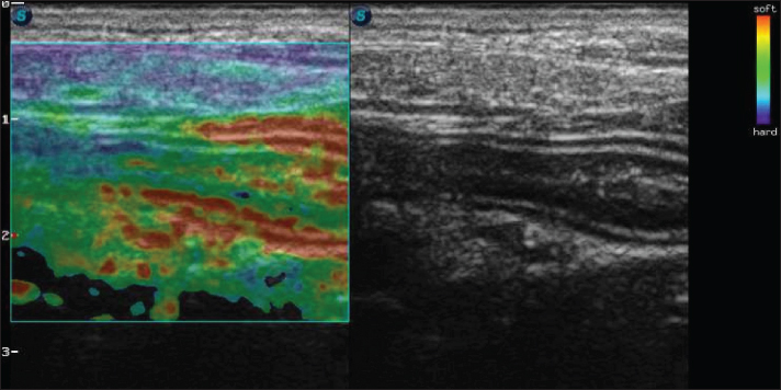 Fig. 2. Color elastography in double projection with a B-mode ultrasound image of a longitudinal scan of the proximal jejunum. The submucosa, muscularis, ventral, and dorsal serosa are red-green; the ventral and dorsal mucosa are blue-green.