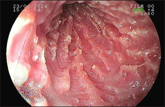 Fig. 4. Duodenoscopy of a dog with intestinal lymphangiectasia. Lacteal dilatation with a raised, whitish appearance in the duodenal mucosa. The CCECAI score was used in dogs with PLE in a correlation study with the expression of a marker associated with lymphatic dilation, with an average score of eight points (Nagahara et al., 2021). Despite the similarity between the definitive diagnosis of this clinical case and the study, there was a discrepancy between the averages of the animals and the value described here, which was initially 12. This indicates the difference in the severity of the clinical signs of this enteropathy. However, this clinical index was important for monitoring therapy because it was reduced after 30 days of treatment. This finding corroborates the report by Resende et al. (2023), who observed a reduction in the clinical activity score in a dog with lymphangiectasia after the use of immunosuppressants, supportive therapy, and diet. An abdominal ultrasound can show intestinal wall thickening and the presence of hyperechogenic striations in the mucosa (Sutherland-Smith et al., 2007) Figure 1A. However, in our patient, the echogenic echoes coalesced in the mucosa, which we believe was associated with greater lymphatic dilation. These results are therefore in line with Malacuns (2021), who found a greater increase in mucosal echogenicity in dogs with lacteal dilatation confirmed by digestive endoscopy. Despite the suggestion of greater severity, our patient’s findings differ from the description (De Magistris et al., 2023), which states that in cases of severe PLE, there may be the formation of lipogranuloma. Table 3. Severity score of histopathologic findings of endoscopic biopsy samples from the stomach and duodenum of a dog with intestinal lymphangiectasia.