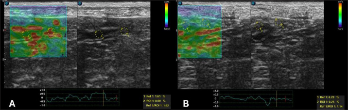 Fig. 3. Semiquantitative cross-sectional deformation elastography of the intestine of a dog with intestinal lymphangiectasia. The SR was obtained by evaluating ROI 1 of the mesenteric and ROI 2 of the dorsal region of the intestinal segment. A duodenum with an SR of 2.58 B-Jejunum with an SR of 1.97 Based on the obtained information, the definitive diagnosis was primary intestinal lymphangiectasia. As a result, a low-fat diet was prescribed (Gastrointestinal low fat, Royal Canin®, Descalvado, São Paulo, SP, Brazil), prednisolone (Predsim®, Mantecorp Farmasa, São Paulo, SP, Brazil) 1 mg/kg orally every 24 hours, chlorambucil (Leukeran®, Aspen Pharma, Rio de Janeiro, RJ, Brazil) 4 mg/m2 orally every 48 hours, and clopidogrel (Manipulado®, Drogavet, Goiânia, GO, Brazil) 1 mg/kg every 24 hours. After 30 days of treatment, there were no more laboratory changes (Table 2), the CCECAI was reduced to four (Table 1), and the patient no longer had diarrhea and gained weight. In addition, hyperechogenicity of the intestinal mucosa was reduced, and the values for elastography of the duodenum were as follows: ROI 1 1.61 % and ROI 0.99 %, with an SR of 1.62 (Fig. 5A). In the jejunum, ROI 1 measured 0.29 %, ROI 0.25%, and SR 1.14 (Fig. 5B). The drugs were withdrawn, and only the corticosteroid, which was reduced to 0.5 mg/kg every 24 hours, was administered. Follow-up was recommended every 2 months and, in cases of recurrence, clinical treatment. DiscussionAfter clinical, laboratory, and dietary screening, the patient was diagnosed with intestinal lymphangiectasia. This result corroborates a recent classification of canine chronic enteropathy, which included intestinal inflammation associated with protein loss (Dupouy-Manescau et al., 2024). The authors believe that this type of enteropathy can be further fragmented into diet-responsive, immunosuppressant-responsive, and non-responsive. We believe that the animals described in this report have immunosuppressant-responsive disease even though the treatment protocol included a low-fat diet. However, we recognize that this case report describes a short period of therapeutic intervention that does not allow differentiation of the type of protein-losing enteropathy (PLE).