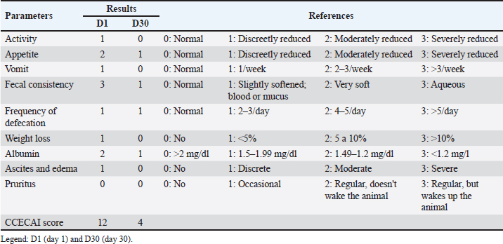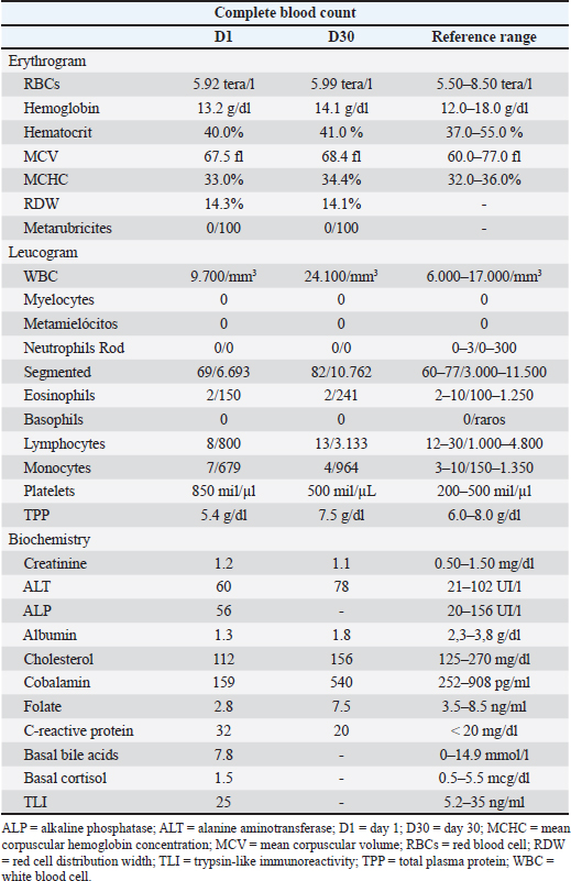 Table 2. Laboratory parameters of a dog with intestinal lymphangiectasia at the start of diagnosis and 30 days after treatment.