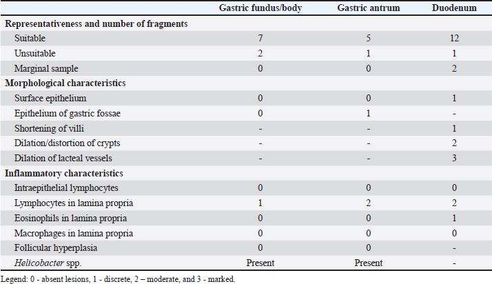 In view of the test results, fenbendazole (Fenzol Pet®, Agener União, São Paulo, SP, Brazil) 50 mg/kg every 24 hours for 3 days was prescribed, and the protocol was repeated after 15 days, as well as a commercial symbiotic. A restrictive hypoallergenic diet containing hydrolyzed protein is recommended for 30 consecutive days. There was no improvement in the clinical signs, and diarrhea persisted. An abdominal ultrasound was performed using SAEVO® FT422 equipment with an 8.0-MHzz multi-frequency microconvex transducer. Gastric thickening (0.71 cm) was observed in the accessible portions, with preserved stratification and a mucosal layer containing intramural gas, suggesting gastritis and gastric pneumatosis. The duodenum and jejunum were also thickened (0.56 and 0.40 cm, respectively), maintaining their layered pattern. The intestinal mucosa exhibited thickening and hyperechogenicity, with coalesced hyperechoic echoes on the luminal surface (Fig. 1A), indicating inflammation associated with lymphangiectasia. Additionally, an enlarged jejunal lymph node was noted, characterized by regular margins, homogeneous echotexture, preserved echogenicity, and dimensions of 4.63 × 1.53 cm (Fig. 1B). Strain elastography was performed using the same ultrasound machine with a linear transducer and a frequency of 10 MHz. The transducer was positioned on the animal’s abdomen, and then, five cycles of compression and decompression were performed. The color histogram was generated and superimposed on the duplicate B-mode image. This map generated images with a colorimetric scale ranging from blue to red for tissues with maximum stiffness, intermediate elasticity, and maximum elasticity. For the static qualitative assessment, the proximal segments of the duodenum and jejunum were analyzed in a longitudinal ultrasound section, and a heterogeneous distribution was found between the dorsal and ventral regions of the intestine, with patterns ranging from predominantly blue with some greenish parts and reddish foci (Fig. 2). To obtain the semiquantitative parameters, the region of interest (ROI) was drawn using the device’s software cursor. Initially, a reference, ROI 1 was obtained in the mesentery adjacent to the intestines, and ROI 2 was drawn in the dorsal region of the duodenum and jejunum. The drawings were similar and circular with the same depth and horizontal direction in the cross-section. The drawings were based on the diameter of the animal’s intestinal mucosa, and the force applied was guided by the elastographic compression wave. The strain ratio (SR) was obtained by calculating the ratio between the ROIs. The values for the duodenum were as follows: ROI 1=1.04 % and ROI=0.4%, with an SR of 2.58 (Fig. 3A). In the jejunum, ROI 1 measured 1.46 %, ROI 0.74 %, and SR 1.97 (Fig. 3B). Given the lack of response to treatment and the test results, the patient was referred for an upper digestive endoscopy. The examination revealed a smooth esophagus with hyperemic cardia mucosa. The stomach had anatomical folds in the body region, and the mucosa had erythematous spots. The pylorus presented a hyperplastic appearance, while the duodenum exhibited edematous mucosa and an irregular surface caused by increased whitish content, which was suggestive of lacteal dilation and duodenitis (Fig. 4). Materials were collected from 15 fragments of the gastric and duodenal mucosa for subsequent histopathological analysis. Histopathological analysis revealed different findings in the stomach and duodenum. In the stomach, slight lymphoplasmacytic infiltration was observed in the lamina propria. In the duodenum, there was no evidence of intraepithelial lymphocytes, but the lamina propria showed discrete eosinophilic infiltrate, moderate lymphoplasmacytic infiltrate along with dilation and distortion of the crypts, as well as dilation of the lacteal vessels. No specific etiological agents or lesions suggestive of neoplasia were identified. The histopathological score adapted from Allenspach et al. (2019) is shown in Table 3.