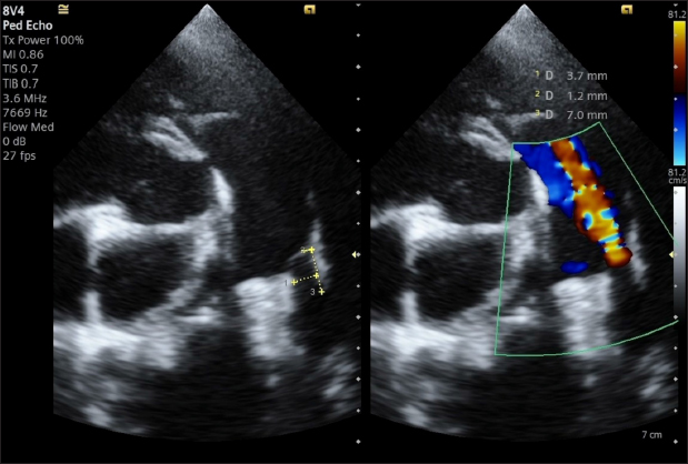 Fig. 3. Intraoperative TEE showing PDA and its measurements (MDD: 1.2 mm; ampulla diameter: 3.8 mm; length: 4.4 mm) and the flow from the aorta to the pulmonary artery (MPA) on CFM Doppler (Dual-mode).
