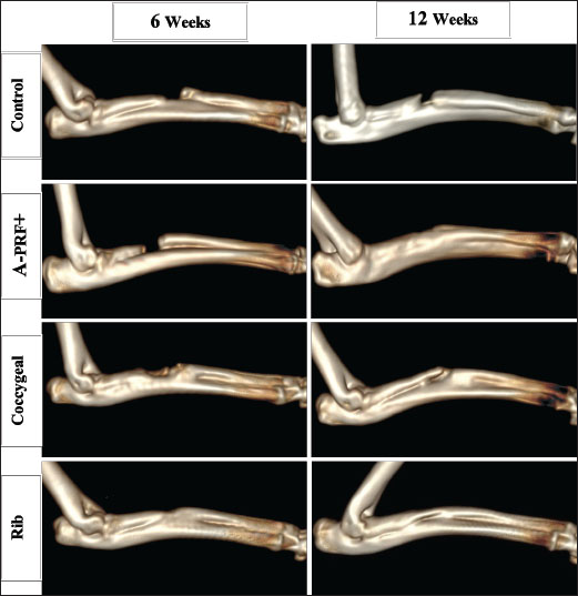 Fig. 4. Three-dimensional CT scans were utilized to assess bone formation for the control, A-PRF+, coccygeal, and rib groups of rabbits with treated segmental bone defects at 6 and 12 weeks post-surgery.
