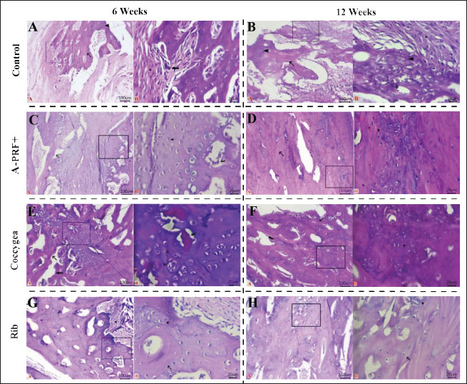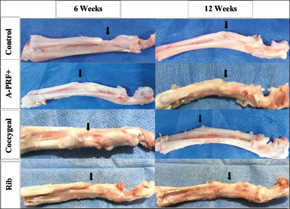 Fig. 6. Macroscopic images of treated radius bone defects across four groups at two time intervals (6 and 12 weeks) post-implantation, with the black arrow highlighting the area of interest. The macroscopic image scoring results of bone specimens, as shown in Figure 7, indicated that the rib groups scored significantly higher than the untreated control group (p < 0.01) and the coccygeal group scored significantly higher than the control group (p < 0.05) at 6 weeks post-surgical treatment. At the same time, no statistically significant differences were observed between the other groups. At 12 weeks’ post-implantation, the A-PRF+, coccygeal, and rib groups demonstrated statistically significant differences as compared to the control group (p < 0.05). Histopathological sections in Figure 8, stained with H and E, found that the bone defect was substituted by more fibrous connective tissue and a reduced presence of calcified cartilaginous tissue and newly formed bone at 6 and 12 weeks post-implantation. At 6 weeks, the A-PRF+ group repaired defect sites with centrally placed hyaline cartilage and fewer calcified chondrocytes. In the coccygeal-treated group at 6 weeks, the bone gap was occupied by newly hyaline cartilage close to the trabecular bone newly formed, with obvious calcified chondrocytes and intervening marrow cavities. The rib group defect location contained mature lamellar bony structures and equivalent amounts of calcified cartilaginous tissue with wide marrow gaps, as well as peripherally distributed granulation tissue at 6 weeks post-operatively. Histopathological sections of the A-PRF+, coccygeal, and rib groups exhibited lamellar bone dominant with lees calcified cartilaginous tissue at 12 weeks. Masson’s trichrome-stained sections in Figure 9 of the control group showed hypercellular fibrous connective tissue alongside fewer neo-fibrocartilages and osseous tissues. The A-PRF+ group had a greater central cartilaginous mass and a few peripheral immature and mature bone tissue at 6 weeks. At 6 weeks, chondroblastic ossification with activated osteoblasts was observed in the coccygeal group. The hyaline matrix and slightly stained mature bone matrix were also present. The 6-week rib group consisted of a mixture of mature and immature bone and cartilage. The osteoblast-surrounded fibrous tissue core was also included. Mature lamellar bone tissue was prevalent in the A-PRF+, coccygeal, and rib groups at 12 weeks after implantation. Emery’s histological score varied significantly between the rib and control groups, as well as the coccygeal and control groups, at 6 weeks’ post-surgery (p < 0.05). However, none of these variations were observed in the other groups (Fig. 10). At 12 weeks postoperatively, the A-PRF+ coccygeal group showed statistical significance compared with the control group (p < 0.05) and compared with the rib and control group (p < 0.01), as shown in Figure 10. DiscussionIn orthopedic surgery, the management of segmental bone defects remains challenging. This study assessed the regeneration efficiency of several autologous rib and coccygeal bones, as well as autologous A-PRF+, for the treatment of segmental defects created in rabbit radial bone. The present study demonstrated that the rib group achieved the maximum bone healing score at 6 and 12 weeks postoperatively, with a statistically significant difference between the rib group and the control group in all diagnostic imaging and histopathological analyses. According to the author’s knowledge, limited research has been available on the use of rib bone grafting for the repair of segmental defects in long bones. In accordance with our study, a cat with femoral nonunion underwent treatment involving a combination of free nonvascularized autogenous rib and iliac bone in addition to rhBMP-2. Bone healing commenced 2 months’ post-surgery and continued for a duration of 1 year. Despite the ongoing moderate lameness, the cat’s ability to move and overall quality of life remained satisfactory (Chung et al., 2021). In human surgery, rib bone grafts provide a source of free, nonvascularized corticocancellous material for the management of various head and neck deformities (Abdel-Haleem et al., 2011). Craniocervical junction abnormalities in children were successfully addressed using an autogenous rib bone graft, with bone fusion verified by CT imaging between 3 and 6 months postoperatively. None of the patients experienced postsurgical problems (Deng et al., 2024). The rib bone, serving as an autologous corticocancellous graft, stands out as an excellent option due to its combination of the reliable structural integrity of cortical bone, which offers mechanical support, and cancellous bone, which is abundant in osteoblasts and osteocytes, thereby boosting its osteogenic potential. Our findings established beyond a reasonable doubt that transplanted rib bone promotes bone formation in radial bone defects, despite the fact that mechanical characteristics were not measured. Sharifi et al. (2012) provided proof regarding the biomechanical properties of rib bone by evaluating the impact of implanted autogenous rib bone, with or without nano-hydroxyapatite, on segmental defects induced in the radial bone of rabbits. Findings showed that autologous rib bone grafts, either alone or in combination with nano-hydroxyapatite, improved osseointegration while retaining strength and stiffness.