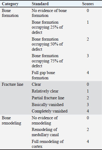 Fig. 1. Autogenous radius bone grafting in rabbits (A): Control group: the defect was left untreated. The white arrow indicates the ulnar bone. (B) and (C): Prepared fibrin clot of A-PRF+. (D): The defect was implanted in A-PRF+. (E) The defect was implanted with the third coccygeal vertebra. (F): The defect was implanted in the 11th rib. Surgical procedureThe rabbits were pre-anesthetized with 0.75 mg/kg of intramuscularly administered acepromazine maleate 1.5% (Castran, Interchemie CO., Netherlands) and a subcutaneous injection of xylazine 2% (Xyla, Interchemie CO., Netherlands) at a dose of 5 mg/kg. The induction of general anesthesia was performed with 35 mg/kg of 5% ketamine hydrochloride (Panpharma Laboratory, Fougères, France) administered intramuscularly (Boudra et al., 2020). The left forelimbs of rabbits were prepared for surgery by shaving and aseptically preparing the skin with 10% povidone-iodine. The animals were then positioned laterally on the operating table. Under general anesthesia, a 4 cm craniomedial surgical incision was made across the left forelimb. The muscles were dissected to expose the radius. A 10 mm segmental radius bone defect was created at the diaphyseal site of the bone, and the interosseous ligament was surgically severed, facilitating the removal of the bone segment. The treatment of radius bone defects was performed according to the designated group distribution, as shown in Figure 1. After filling the bone defect, the internal fixation of the radius was considered unnecessary because the ulna provided adequate support. The surgical incision was subsequently closed with 2/0 vicryl sutures for the muscle and subcutaneous layers and 2/0 braided silk sutures for the skin. Cefazolin sodium 1 g (Zinol, Pharco Pharmaceuticals, Alexandria, Egypt) was given intramuscularly for 5 days at a dosage of 20 mg/kg (Demirel and Aksakal, 2015). To alleviate postoperative pain, meloxicam 0.75% (Amriya Pharmaceutical Industries, Alexandria, Egypt) was administered at a dosage of 0.6 mg/kg subcutaneously for a duration of 3 days (Varga, 2014). The rabbits were monitored in a recovery room post-surgery until they regained consciousness. The surgical skin stitches were taken out 7 to 10 days after the operation. The rabbits were sacrificed at 6 and 12 weeks following the surgery. Radiography and computed tomography (CT) were used to assess the treated radius bone defects, along with histopathological evaluation including macroscopic and microscopic analyses. Radiography and CT scanA radiographic evaluation was conducted using an X-ray generator (Pox-300 BT, Toshiba, RotanodeTM, Japan) with exposure factors of 2.5 mAs, 40 kVp, and 50 mA. A mediolateral radiograph was acquired on the day of surgery, as well as at 6 and 12 weeks post-surgery. Two orthopedic specialists independently assessed the treated bone defect area using the Lane–Sandhu radiographic scoring criteria, as shown in Table 1 (Zhao et al., 2021). CT scans of repaired radius bone defects were performed at 6 and 12 weeks postoperatively using a GE Lightspeed VCT 64 CT system (WIPRO GE HEALTHCARE PVT. LTD., Karnataka, India) at 140 KV and 50 mA. The RadiAnt DICOM viewer (Medixant, Poznan, Poland) was used to visualize the reconstructed coronal and three-dimensional (3D) images. The treated bone defect site was scored by two blinded orthopedic experts using Cheung’s grading standards, as shown in Table 2 (Ibrahim et al., 2016). Histopathological evaluationEvaluations at the macroscopic level were conducted 6 and 12 weeks post-surgery. The soft tissue was removed from the left radius and ulnar bone. The bones were subsequently imaged and assessed by two specialists using the scoring system of 0 to +3 as defined by Parizi et al. (2013). A score of 0 signifies complete instability at the defect site, indicating nonunion. Scores of +1 and +2 were given when cartilage, soft tissue, or cracks were observed within the defect, suggesting a potentially unstable union. Bone bridging, signifying a complete union, was assigned a score of +3. Samples from repaired radius bone defects of rabbits were collected for microscopic examination at 6 and 12 weeks post-operations using a slow-speed saw. The samples were then fixed in a 10% buffered neutral formalin solution for 48 hours, decalcified for 3 weeks in a mixture of hydrochloric acid HCl 10% and formic acid 10%, dehydrated in an increasing ethanol gradient, cleared in xylene, and embedded in paraffin wax. Five micron-thick paraffin block sections were cut using a microtome (Leica RM 2155, England). The defect sites were subjected to longitudinal sections. Hematoxylin and eosin (H and E) and Masson’s trichrome were used to stain the specimens. Two separate histopathologists conducted the assessment process blindly, examining and analyzing all slides from all groups using Emery’s scoring system, as shown in Table 3 (Emery et al., 1994). Table 1. Lane–Sandhu radiographic scoring criteria.