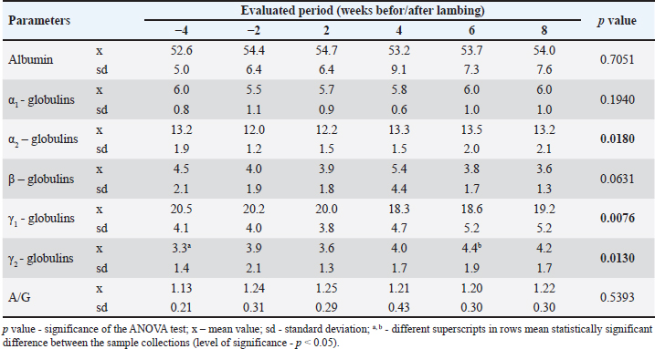 Table 2. Changes in the absolute concentration of total proteins (TPs) and the analyzed protein fractions in ewes during the peripartum period (g/l).