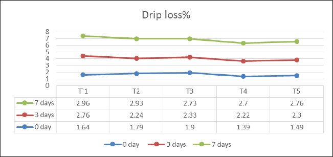 The PH value is expressed as followsThe pH of the minced meat was measured according to the method described by Verma et al. (2008) by homogenizing a 10 g minced meat sample with 100 ml of distilled water via a German Gerhardt homogenizer. The sample solutions were subsequently centrifuged for 15 minutes at 2,000 gx. The mixture was filtered through filter paper No. 1, 1 and the pH was measured using a pH meter (Sadakuzzaman et al., 2021). Determination of thiobarbituric acidApproximately 1 g of the meat sample was homogenized with 25 ml of a cold solution containing 20% trichloro acetic acid (TCA) dissolved in phosphoric acid with a concentration of 2 M in a homogenizer for 2 minutes. The mixture was transferred to a 50-ml volumetric flask, and the volume was filled to the mark with distilled water. The mixture was mixed, and 25 ml was collected and centrifuged at a speed of 3,000 rpm for 30 minutes and filtered through filter paper No. (1). Then, transferred 5 ml of the filtrate to a test tube and 5 ml of thiobarbituric acid reagent solution to it [dissolve a 1 g powder of TBA reagent with 75 ml of double distilled water (90°C–100°C) and mix thoroughly]. Then, 30 ml of N 0.6 of glacial acetic acid was added mixed fully with 50 ml of 25% TCA solution, and cooled to room temperature. Prepared 0.005 M. Blanc’s solution was prepared by mixing 5 ml of distilled water with 5 ml of the reagent solution. The contents of the test tubes were mixed well, closed tightly, and kept in a dark place for 15–16 hours at room temperature. The contents were heated in a water bath for 30 minutes (Tarladgis et al., 1964). The absorbance (A) of the resulting color was measured at a wavelength of 530 nm using a spectrophotometer. The thiobarbituric acid value was calculated by multiplying the absorbance value by the factor 5.2, and the value was expressed on the basis of mg malondialdehyde/kg meat according to the following equation: thiobarbituric acid value (mg MDA/kg meat)=5.2 × A530. Microbiological countsA total of 10 g of lamb meat sample was homogenized with 90 ml of peptone buffer solution for microbial assessment of the total bacteria count and coliform count. The dilutions were prepared from the 101–109 dilution and then cultured via the pour plate method using the diluted 10−6 and enumerated after incubation at 32°C for 24 hours. The cultured media consisted of plate count agar and violet red bile agar (Wali and Abed, 2019; Terrones-Fernandez et al., 2023). Static AnalysisAll data were estimated as the mean ± SD of the experimental data. The data were analyzed using SPSS for analysis of variance (p < 0.05) using (ANOVA) on a two-way basis (SPSS, 2008). The number of repetitions for the analyses (n value) was five. Result and DiscussionPhysical characterizedDrip loss value of lamb meatAs shown in Figure 1, there were significant differences (p < 0.05) lower on drip loss value in all groups: 0, 3, and 7 days of storage at 4°C. Notably, the percentage of drip loss in the T4 treatment group (200 ppm) was 1.39% ± 0.50%, 2.22% ± 0.32%, and 2.70% ± 0.38%, respectively, whereas the lower drip loss value was recorded in T5: 1.49% ± 0.16%, 2.30% ± 0.48%, and 2.76% ± 1.33%, respectively, in all treatment groups and storage periods: 0, 3, and 7 days. The highest percentage of drip loss was 1.64% ± 0.30%, 2.76% ± 0.24%, and 2.96% ± 0.27%, respectively, in control treatment T1 (without treatment) for all storage periods. Water-hold capacity of lamb meatThe results (Fig. 2) revealed a significant difference (p < 0.05) increase in water-holding capacity between the fresh lamb meat of the treatment and control group throughout the period and during refrigerator storage. In the sample treated with T4 (200 ppm) and T3 (150 ppm) CA, the increase in water-holding capacity recorded was 30.69% ± 2.75%, 36.24% ± 5.16%, and 42.08% ± 5.83%, respectively, in treatment T4 and 29.68% ± 2.89%, 35.44% ± 4.83%, and 38.88% ± 7.22%, respectively, in treatment T3. The lowest values for the ability of meat to retain water were 27.59% ± 2.34%, 24.34% ± 1.85%, and 19.68% ± 1.43%, respectively, in the control treatment (T1) in all treatments and all storage periods (0, 3, and 7 days). PH value of lamb meatThe present study (Fig. 3) revealed a significant (p < 0.05) difference in the pH value of fresh lamb meat between different concentrations and storage periods in all treated meat samples that were stored at 4°C. The results reveal a significantly different increase (p < 0.05) in the pH value for lamb meat samples treated with (200 and 150 ppm) of CA and BHA, respectively, and control samples during the storage period at 4°C. The control group recorded lower pH values of 5.75 ± 0.037, 5.82 ± 0.031, and 5.95 ± 0.033, while the groups treated (200 ppm) with CA recorded high pH values of 0.020 ± 5.80, 5.96 ± 0.032, and 5.99% ± 0.036%, respectively, during the storage period. In addition, the sample treated with T5 (150 ppm) the pH values were 5.72 ± 5.72 ± 0.022, 0.067, and 5.92 ± 0.038, respectively. Chemical characterizedThiobarbituric acid value of lamb meatThe present study (Fig. 4) revealed a significant (p < 0.05) difference between the treatments and the different storage periods in terms of the thiobarbituric acid value of fresh lamb meat. Treatment T4 (200 ppm) resulted in lower values of thiobarbituric acid during the entire storage period with values of 0.10 ± 0.10 ± 0.008, 0.007, and 1.21% ± 0.09%, respectively, than the 0.12 0.12 ± 0.01, ± 0.008, and 1.36Z ± 0.06% for T3 (150 ppm) CA, respectively. Compared with those of the control groups, T1 (without added) had high values of 0.19 ± 0.01, 0.25 ± 0.02, and 2.3 ± 0.23, respectively, during the entire storage period. There was a significant difference between all the different treatments during the storage period.