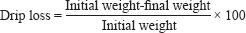 Water-holding capacityFifty grams of each treatment mixture were weighed and homogenized with 50 ml of distilled water for 1 minute, according to methods of Sadakuzzaman et al. (2021), after which the mixture was placed in a centrifuge at a temperature of 4°C and a speed of 5,000 rpm for 10 minutes, after which the percentage of the meat’s ability to retain water was calculated according to the following equation: