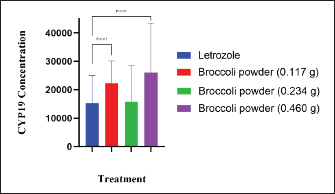 Fig. 6. CYPI9 concentrations in male rats in the presence of letrozole and broccoli powder The concentration of CYP19 may increase with higher concentrations of broccoli powder, as noted by Reed et al. (2006), who suggested that saturation could occur in the absorption and excretion processes. When the efflux transporter becomes saturated by the absorbed DIM, the efflux rate stabilizes; however, absorption via diffusion continues to increase with the dosage. This mechanism is attributed to the low bioavailability of DIM (Staub et al., 2006), whereas passive uptake of DIM is significant in cells (Anderton et al., 2004). The recommended dosage ranges from 400 to 600 mg, and the minimum effective dose is 300 mg per day (Wong et al., 1997). The maximum CYP19 level recorded in our study was 0.460 g of broccoli powder, which corresponded to an I3C dosage of 800 mg. Further research is necessary to determine the optimal maximum I3C dose for regulating reproductive hormones in male animals, confirm these findings, and establish the most effective long-term dosing schedule. Furthermore, other compounds that could enhance the effectiveness of broccoli powder should be explored. ConclusionOur study demonstrated that I3C can influence CYP19 concentrations, potentially regulating testosterone levels in male rats. This research shows that I3C has the potential to be a natural aromatase blocker, but it exhibits unstable results. However, this does not mean that I3C in broccoli cannot be used as an aromatase blocker. However, further research is necessary to elucidate the mechanisms by which I3C affects testosterone given its diverse properties depending on the target. This diversity complicates the identification of I3C contributions to in vivo activity. Further studies with more specific research are needed to explain the contribution of I3C in maintaining the stability of the T:E ratio. Moreover, our research is currently in the biomolecular prediction stage. It could yield comprehensive findings if extended to in vitro and in vivo studies incorporating a wider array of treatments. AcknowledgmentThe authors thank Universitas Gadjah Mada and the Ministry of Research and Technology of the Republic of Indonesia. FundingThis research was supported by the Ministry of Research and Technology of the Republic of Indonesia (grant number 2067/UN1/DITLIT/PT.01.03/2024). Author’s contributionsAll authors made significant contributions to this research. RA conducted the study, performed the analyses, and drafted the manuscript. TO, CMA, ISP, HS, AB, and PA assisted with data analysis, critically reviewed the draft, and offered valuable feedback to improve the manuscript. All authors have reviewed and approved the final version of the manuscript. Conflict of interestThe authors have not stated any conflicts of interest. Data availabilityAll data supporting the results of this study are accessible in the manuscript. ReferencesAmalia, R., Airin, C.M., Astuti, P. and Budiyanto, A. 2024. Indole-3-carbinol of broccoli powder can decrease the estrogen production of male rats. J. Anim. Health Prod. 12(4), 647–653. Anderton, M.J., Manson, M.M., Verschoyle, R.D., Gescher, A., Lamb, J.H., Farmer, P.B., Steward, W.P. and Williams, M.L. 2006. Pharmacokinetics and tissue disposition of indole-3-carbinol and its acid condensation products after oral administration to mice. Clin. Cancer. Res. 10(15), 5233–5242. Astuti, P., Airin, C.M., Nurrurozi, A., Aidi, R., Hana, A., Hadi, S. and Harimurti, H. 2020. Potential natural aromatase blockers on enhance the frequency and sound quality of male canaries. In Proceedings of the 1st International Conference on Veterinary, Animal, and Environmental Sciences, Bengaluru, pp: 3. Auborn, K.J., Fan, S., Rosen, E.M., Goodwin, L., Chandraskaren, A., Williams, D.E., Chen, D. and Carter, T.H. 2003. Nutritional genomics in cancer processes indole-3-carbinol is a negative regulator of estrogen. Int. J. Nutr. 133, 2470S–2475S. Auvray, P., Nativelle, C., Bureau, R., Dallemagne, P., Séralini, G. E. and Sourdaine, P. 2002. Study of substrate specificity of human aromatase by site directed mutagenesis. Eur. J. Biochem. 269(5), 1393–1405. Barba-Ostria, C., Carrera-Pacheco, S.E., Gonzalez-Pastor, R., Heredia-Moya, J., Mayorga-Ramos, A., Rodríguez-Pãlit, C., Zúãiga-Miranda, J., Arias-Almeida, B. and Guamãn, L.P. 2022. Evaluation of biological activity of natural compounds: current trends and methods. Molecules. 27(14), 4490. Chen, I., Safe, S. and Bjeldanes, L. 1996. Indole-3-carbinol and diindolylmethane as aryl hydrocarbon (Ah) receptor agonists and antagonists in t47d human breast cancer cells. Biochem. Pharmacol. 51(8), 1069–1076. Dupont, W.D. and Parl, F. 1998. Association of cytochrome P450 1B1 (CYP1B1) polymorphism with steroid receptor status in breast cancer. Cancer Res. 58(22), 41–5038. Elkhalifa, A.E.O., Al-Shammari, E., Kuddus, M., Adnan, M., Sachidanandan, M., Awadelkareem, A.M., Qattan, M.Y., Khan, M.I., Abduljabbar, S.I., Baig, S.M. and Ashraf, S.A. 2023. Structure-based multi-targeted molecular docking and dynamic simulation of soybean-derived isoflavone genistin as a potential breast cancer signaling proteins inhibitor. Life. 13(8), 1739. Greenwald, P. 2004. Clinical trials in cancer prevention: current results and perspectives for the future 1. J. Nutr. 134, 3507S-3512S. Jeffery, E.H. and Araya, M. 2009. Physiological effects of broccoli consumption. Phytochem. Rev. 8(1), 283–298. Kachakova, D., Mitkova, A., Popov, E., Beltcheva, O., Vlahova, A., Dikov, T., Christova, S., Mitev, V., Slavov, C. and Kaneva, R. 2016. Polymorphisms in androgen metabolism genes AR, CYP1B1, CYP19, and SRD5A2 and prostate cancer risk and aggressiveness in Bulgarian patients. Turk. J. Med. Sci. 46(3), 40–626. Kataoka, T., Hotta, Y. and Kimura, K. 2021. A Review of foods and food supplements increasing testosterone levels. J. Men’s Health. 17(2), 4–14. Katz, E., Nisani, S., Chamovitz, D.