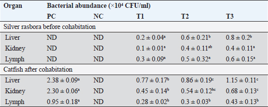Fig. 1. Mean values for hematological parameters in catfish (Clarias sp.) pre- and postcohabitation with E. tarda carrier silver rasbora (R. argyrotaenia). PC: positive control; NC: negative control; E. tarda carrier silver rasbora cohabitate with catfish at ratios of 1:1 (T1); 1:2 (T2), and 2:1 (T3). a. RBCs, b. Hb, c. WBCs, d. Neutrophils, e. Monocytes, and f. Lymphocytes. Table 1. Bacterial abundance of different organs in silver rasbora and catfish before and after cohabitation. Different superscript showed significant different (p < 0.05).