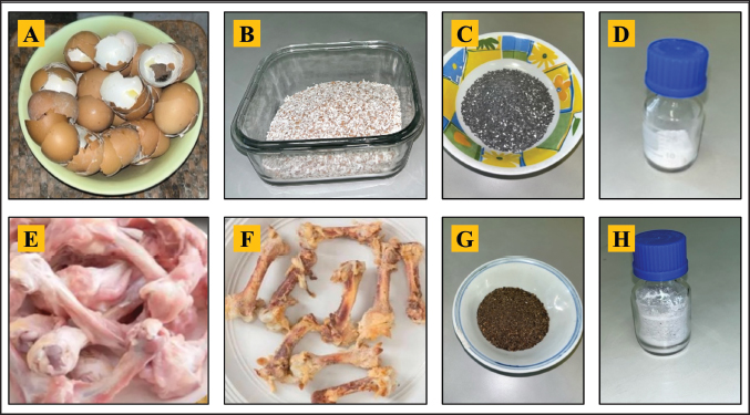 Fig . 1. Laboratory procedures for synthesizing HA from eggshells and chicken bones. A–D illustrates the stepwise processing of eggshells, from raw material preparation (A) to grinding (B), calcination (C), and the final HA product (D). E–H depicts the same stages for chicken bones, highlighting differences in raw material handling and processing.
