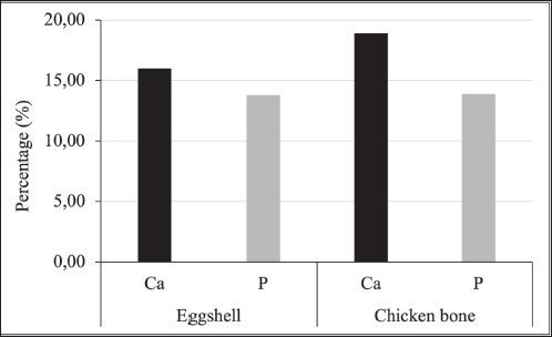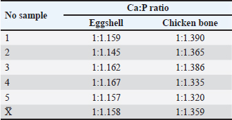 Fig. 2. Bar graph comparing Ca and P levels in synthesized HA from eggshells and chicken bones. Ca:P ratioThe Ca:P ratios of the eggshell and chicken bone samples were calculated and summarized in Table 2. The average Ca:P ratio of the eggshell samples was 1:1.158. 1:1.158, with individual ratios ranging from 1:1.145 to 1:1.167, indicating a relatively uniform distribution. The Ca:P ratio was higher in chicken bone samples, with an average of 1:1.359, with individual values ranging from 1:1.320 to 1:1.390. The higher Ca:P ratio in chicken bones suggests a higher Ca content relative to P than in eggshells. These differences in Ca:P ratios reflect the compositional variations between the two biological sources and may influence their performance in HA synthesis. DiscussionThe synthesis of HA from broiler chicken eggshells and chicken bone waste via calcination at 800°C demonstrated the feasibility of using these biomaterials as sustainable sources for HA production. Notably, chicken bone-derived HA had higher Ca and P content than eggshell-derived HA, which is consistent with our hypothesis. These findings underscore the potential of chicken bones as a more efficient raw material for HA synthesis, with promising applications in bone repair and regeneration in veterinary medicine. Furthermore, the comparison highlights the importance of selecting optimal raw materials to maximize HA yield and quality. The observed differences in Ca and P levels between eggshells and bones can be attributed to their distinct biological functions. Eggshells primarily serve as protective barriers and are rich in calcite, a crystalline form of calcium carbonate, whereas bones are composed predominantly of HA and other calcium phosphate-based minerals (Betancourt and Cree, 2017; Hahn et al., 2017). The compositional disparity is evident in the slightly higher Ca levels in bones, which are necessary for mechanical strength and structural integrity (Opris et al., 2020). Such levels are expected because 98% of Ca is stored in bones, whereas Ca and P are distributed to the eggshell only during production (Pelicia et al., 2009). In contrast, eggshells’ relatively lower Ca content may be due to their thinner and less mineralized structure than bone tissue (Kattimani and Lingamaneni, 2019). Compared with other studies, broiler chicken bone’s Ca and P levels are consistent with previously reported values for poultry bone-derived HA, reinforcing their suitability as raw materials (Kim et al., 2017; Li et al., 2020). However, the Ca levels in eggshells were slightly lower than those reported in other studies on calcium carbonate-rich materials (Brun et al., 2013; Bartter et al., 2018). This discrepancy may be due to regional variations in diet, genetics, or environmental factors influencing mineral deposition in broiler chickens from the Yogyakarta Special Territory. Table 2. Comparison of Ca and P ratio.