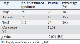 AbstractBackground: Neospora caninum is a significant intracellular protozoan that invades dogs as definitive and intermediate hosts, particularly farm animals as intermediate animal hosts. This parasitic infection leads to extreme financial losses due to reproductive distress and neurological illnesses in dogs. Aim: The current study aimed to identify N. caninum in domestic and stray dogs from different areas of Babylon province and to evaluate the influence of risk factors like sex, age, and months, on the ratio of infection. Methods: Based on serological tests Indirect Enzyme-Linked Immunosorbent assay, (iELISA), a total of 146 blood samples were collected from dogs, with 76 and 70 samples collected from stray and domestic dogs, respectively, from July to December (2024). Results: The overall prevalence rate was 26.7% (39/146), whereas the infection rate in stray dogs was 36.8% (28/76), which was higher than that in domestic dogs at 15.7% (11/70), with a highly significant difference (p≤0.05). No significant difference was observed (p ≥ 0.05) between the sexes; the proportion of males was 29.3% (22/75) and that of females was 23.9% (17/71). The higher ratio of infection in domestic dogs was investigated in the adult age group, 17.5% (7/41), in comparison with the lower infection rate of 13.7% (4/29) in the puppies, with no significant statistical difference (p ≥ 0.05). A monthly analysis demonstrated a higher infection rate in stray dogs and domestic dogs (34.6%) in September, followed by October (32%), whereas a lower infection rate was found in November (18.1%), followed by December (13%). Conclusion: The present study used serological diagnostic examination methods, particularly ELISA, to identify the critical role of stray and domestic dogs in the epidemiological cycle of neosporrosis and dissemination of N. caninum infection among animals in Babylon Province, Iraq. Keywords: Neosporosis, Dogs, Babylon, ELISA, Blood. IntroductionThe apicomplexan protozoan Neospora caninum is widely distributed geographically and causes significant financial strain on farmers and the livestock industry (Huaman et al., 2023; Nazari et al., 2023). Dogs in Norway were first identified with this infection in 1984 (Bjerkas et al., 1984). The parasite shares a large number of morphologic and biological characteristics with its close relative, Toxoplasma gondii (Dubey and Schares, 2006). N. caninum has an advanced life cycle, and its sexual cycle occurs exclusively in canids, which are recognized as the protozoa’s definitive hosts, such as domestic and wild dogs (Yang et al., 2022) and coyotes (Gharekhani et al., 2022). Asexual reproduction occurs within intermediate hosts (Dubey and Schares, 2007). Neospora can spread vertically in dogs during the last stages of pregnancy or after birth through milk (King et al., 2011), while horizontal transmission involves consumption of infected tissues from intermediate hosts harboring tissue cysts (Khan et al., 2020). Infected dogs exhibit neuromuscular symptoms, including encephalomyelitis and myositis, which can cause paralysis and premature puppy death (Al-Qassab et al., 2010). Depending on the location where the parasite multiplies in the central nervous system, adult dogs may exhibit a variety of neurological symptoms, with the most common manifestations including rigid hyperextension and paralysis of the pelvic limbs (Reichel et al., 2007; Dubey et al., 2017). The diagnosis of neosporosis can be made using a variety of serological methods, including the Indirect Hemagglutination Assay, Neospora Agglutination Test, Latex Agglutination Assay ELISA Enzyme-Linked Immunosorbent Assay (ELISA), and indirect fluorescence antibody test. ELISA has high sensitivity and specificity and, is the most crucial serological test used in the laboratory diagnostics of neosporosis (Gao and Wang, 2019). The lack of knowledge on the application of Elisa for detecting N. caninum in dog blood samples and the effect of specific risk agents on the infection rate in Babylon province served as the impetus for this study. Materials and MethodsCollection of samplesFrom July to December 2024, 146 blood samples were drawn from the jugular or cephalic veins of randomly selected domestic and stray dogs of both sexes and ages from various locations in Babylon Province. This exercise was performed using sterile tubes without anticoagulant, a sterile syringe, and a disposable glove to form serum. After being chilled during transit to the parasitological laboratory at the University of Al-Qadisiyah’s College of Veterinary Medicine, the blood samples were centrifuged for 10 minutes at 3,000 rpm to extract the serum, which was then stored in 1.5 ml Eppendorf tubes at –20°C until subjected to indirect ELISA (Fanokh and Al-Rubaie, 2022). Indirect ELISACompared with other serological techniques, the ELISA method offers numerous benefits that make it the best option for a wide range of scientific and medical applications. These benefits include high sensitivity, flexibility, simplicity, speed, accuracy, and dependability; reasonable cost; and the ability to conduct multiple experiments simultaneously on multiple samples. In accordance with the manufacturer’s protocol (Company, SUNLONG, and Origin, China), indirect ELISA was used in this study to detect anti-N. Caninum antibodies in dog serum. A microtiter plate reader (BioBase, China) was used to measure the optical density (O.D.) at 450 nm. The cutoff value was determined using the following formula: Critical=average of the negative control well + 0.15. The results were interpreted as follows: Negative results=sample O.D. < calculated critical (cutoff). Positive results=sample ≥ calculated critical (cutoff). Statistical analysisData were collected, tabulated, and statistically analyzed using a personal computer with the “Statistical Package for the Social Sciences version 26 program” (IBM Corporation, Armonk, NY, USA). The chi-squar
