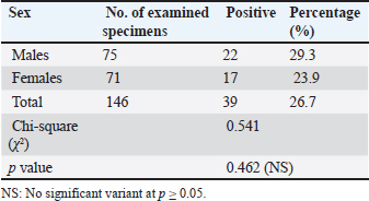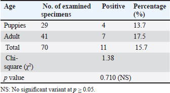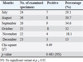 Infection rate according to sexMale dogs exhibited a higher rate of infection at 29.3% (22/75), whereas female dogs had a lower infection rate of 23.9% (17/71). Table 2 reflects that this variance has no statistical significance at p ≥ 0.05. Infection rate in household dogs according to ageAmong domestic dogs, the infection rate was lowest in the puppies (young age group) at 13.7% (4/29), whereas the infection rate was highest in the adult age group at 17.5% (7/41) without significant statistical variance at p ≥ 0.05 Table 3. Infection rate in monthsTable 4 shows that the incidence of N. caninum was highest in September (34.6%), followed by October (32%), whereas there was a lower incidence in November (18.1%), followed by December (13%) without significant statistical variance at p ≥ 0.05. DiscussionNeospora caninum is a pathogenic intracellular parasite that specifically affects cattle and causes abortion or neonatal death in a variety of animal species (Amdouni et al., 2022). Dogs play an important role in sustaining the infection and facilitating a storm of abortion because of the horizontal spread of N. caninum to domestic animals (Gharekhani et al., 2020a). The current study’s findings indicate that the overall seroprevalence of N. caninum infection in dogs is 26.7% (39/146), which is higher than the infection rates recorded in Baghdad province, Iraq at 24.17% (Fanokh and Al-Rubaie, 2022), Turkey at 10% (Coskun et al., 2000), Iran at 10.6% (Khanmohammadi and Fallah, 2011), and Germany at 7.33% (Villagra-Blanco et al., 2018). However, it is lower than the rates found in Wasit province, Iraq, 46.74% (Altaee et al., 2022), in the central Zagros region of Iran, 43.3% (Beki et al., 2023), in Turkey, 55.5% (ã–cal et al., 2014), and in Italy 32% (Robbe et al., 2016). The seroprevalence of N. caninum in dogs varies globally based on the study methodologies, number of animals studied, study location, serological technique, sensitivity, sample, technician, and laboratory, as well as direct exposure to possible infection sources and feeding practices (Gharekhani et al., 2020b).