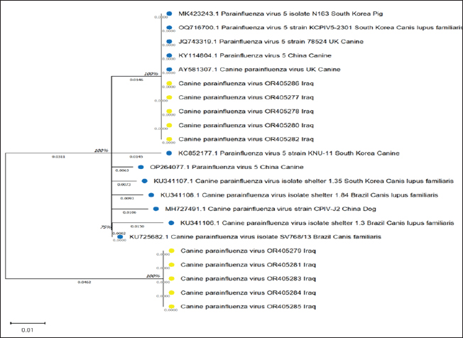 Fig. 3. Evolutionary analysis by maximum likelihood method was inferred for the identified canine parainfluenza virus in Iraq (referred to with yellow circles) followed by the obtained accession numbers (translated into their relevant amino acids). These were compared with other global sequences (referred to with blue circles) and their relevant strains. The tree is drawn to scale, with branch lengths measured in the number of substitutions per site (below the branches). This analysis involved 22 amino acid sequences. Evolutionary analyses were conducted in MEGA11 (Tamura et al., 2021).