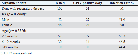 AbstractBackground: This study aimed to detect canine parainfluenza virus-5 (CPIV-5) in dogs in Baghdad city, using reverse transcriptase-quantitative polymerase chain reaction (RT-qPCR) and conventional nested (RT-nPCR) techniques, along with phylogenetic analysis. Methods: Nasal swabs were obtained from 150 dogs, (100 sick dogs showing respiratory distress and 50 apparently healthy dogs), from January 2023 to April 2024. Results: CPIV-5 was detected by RT-qPCR in 51 out of 100 sick dogs (51%) and 17 out of 50 apparently healthy dogs (34%). All positive RT-qPCR samples were rechecked by RT-nPCR. Ten final RT-nPCR products were sequenced, and the data were deposited in NCBI Gene Bank. These samples were categorized as CPIV-5 based on nucleocapsid protein gene analysis. The phylogenetic analysis based on amino acids revealed that local strains were distinct, with the first cluster sharing identity and similarity scores with international isolates, while the second cluster differed significantly from international isolates and could be Iraqi strains. Conclusion: This study concluded for the first time on the presence of CPIV-5 in both sick and apparently healthy dogs. The latter could act as reservoirs of the virus, contributing to the transmission of the disease to susceptible dogs, ultimately leading to increased morbidity. Keywords: CPIV-5, RT-qPCR, Nested RT-PCR, Phylogenetic analysis, Iraq. IntroductionCanine parainfluenza virus 5 (CPIV-5) whose scientific denomination, according to the International Committee on Taxonomy of Virus, is Mammalian orthorubulavirus 5 and is classified in the Mononegavirales order, Paramyxoviridae family, and the Orthorubulavirus genus (Rima et al., 2019) that poses a major threat to mammal and human health (Zhou et al., 2024; Yang et al., 2024). It is a significant viral pathogen in dogs, widely distributed and impacted as a primary pathogen in canine infectious respiratory disease (CIRD) or “kennel cough,” causing secondary pneumonia (Cheng et al., 2023; Yang, et al., 2022). The virus is transmitted through aerosols, causing respiratory diseases and lesions in the nasal mucosa, pharynx, trachea, and bronchi with petechial hemorrhages in the lungs, the incubation period is usually 2–10 days, with clinical signs such as harsh cough for 2–6 days, nasal discharge, tonsillitis, pharyngitis, and sometimes fever (Reagan and Sykes, 2020; Sykes, 2022; Cordisco et al., 2022). The diagnosis is dependent on the detection of the virus in the throat and nasal secretions by RT-PCR method, the determination of a rising antibody level by enzyme- linked immunosorbent assay, and hemagglutination inhibition, whereas virus neutralization test is a useful method (Reagan and Sykes, 2020; Yang et al., 2024). Molecular reactions are used as quick and sensitive diagnostic tools for respiratory virus infections in humans and animals (Salah et al., 2020; AL-Mutar, 2020; Al-Saadi, 2020; Al-Hussaniy et al., 2022). RT- qPCR assays are costly but offer high sensitivity and specificity, saving time, and preventing contamination, particularly in CPIV-5 in CIRD-affected samples (Arya, 2005; Bustin et al., 2009; Kralik and Ricchi, 2017). Previously, RT-nested PCR (RT-nPCR) assays were used to detect CPIV-5 and for surveillance in CIRD-affected or healthy dogs (Erles et al., 2004; Hiebl et al., 2019; Charoenkul et al., 2021). In Iraq, various canine diseases have been researched (Faraj, 2019; Badawi and Yousif, 2020; Mansour and Hasso, 2021; Al-Mosoy et al., 2022; Hussein and Al-Graibawi, 2024; Jbr and Jumaa, 2024) with no previous studies on CPIV-5. So, this study was designed to investigate the virus in dogs in Baghdad city. Moreover, understanding CPIV-5 epidemiology is essential for developing effective diagnostic strategies, therapeutic, and vaccination or monitoring programs. We assume that the current study posits that addressing these gaps through rigorous investigation will enhance knowledge of CPIV-5 impact on canine health. This study represents a vital step toward filling the existing knowledge void regarding CPIV-5 in Iraq and may inform future research directions and veterinary practices. So, this study aimed to detect CPIV-5 in Baghdad province using RT-qPCR and RT-nPCR techniques with phylogenetic analysis. Materials and MethodsOne hundred and fifty nasal swab samples were collected from (100 sick dogs showing respiratory distress and 50 apparently healthy dogs) which were randomly selected from Baghdad Veterinary Hospital and private veterinary clinics in Baghdad City, Iraq, from January 2023 to March 2024. Their ages ranged from 1 month to 12 years. Demographic data for the animals, including detailed clinical examination, sex, age, breed, being housed in groups or individually, and history of vaccination, were recorded (Reagan and Sykes, 2020). Nasal swabs were kept in viral transport media tubes in a cooled box using ice bags, transferred to the laboratory, and then stored in liquid nitrogen after transferring the media into cryotubes. RNA extraction was performed using a viral nucleic acid extraction kit according to the manufacturer’s instructions (ADDBio, Korea) and performing complementary DNA (cDNA), which was kept frozen at –20°C until the RT-nPCR test was performed. cDNA was synthesized with the commercial kit (ADDBio, Korea) as instructed by the manufacturer. Molecular detection of CPIV-5 was conducted using RT-qPCR with primers and AddScript RT-qPCR SYBER master (AddBio, Korea)-based assay, and the reaction included H2o 6 μl, AddScript RT-qPCR 10 μl, and 0.05 pmol/20 μl for each primer was add, the forward primer was AGTTTGGGCAATTTTTCGTCC, and the reverse primer was TGCAGGAGATATCTCGGGTTG and cDNA 2 μl (Hiebl et al., 2019). Thermal conditions involved activation at 50ºC for 2 minutes, initial denaturation at 95ºC for 10 minutes, denaturation at 95ºC for 15 seconds, followed by annealing at 56.3ºC for 30 seconds, and extension at 72ºC for 35 