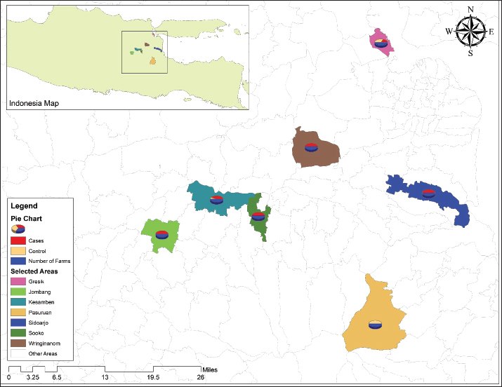 Fig. 1. Map of FMD outbreaks in East Java province study districts. Data collectionFMD outbreak data and case definition Data were collected with the collaboration of the provincial livestock office of East Java and Faculty of Veterinary Medicine Airlangga University regarding FMD outbreak risk factors, as district livestock officers identified FMD outbreaks at different farms. Those farms were considered case farms where a Swab or tissue sample from an animal exhibiting classic clinical signs of FMD was confirmed to be FMDV positive using PCR or enzyme-linked immunosorbent assay techniques in the dedicated FMD laboratories of the relevant districts. Evaluation of risk factors using case–control study The probability of FMD outbreaks occurring on farms in 2022 was investigated using a case−control study. The goal of this research was to determine the risk factors most closely associated with FMD outbreaks. In the current study, a farm is defined as any piece of land that is used to raise cows or buffaloes for the purpose of producing milk or meat, independent of the number of animals that are kept on the land. If a farm had at least one animal that tested positive for FMD, it was classified as a case farm. In addition, any farm that tests positive for FMD from this point onward will be referred to as an epidemic of FMD. During this period, farmers from the control farms who had not seen any clinical symptoms suggestive of FMD were randomly chosen from the same location as the FMD-infected farm. Veterinary professionals inspected the farms to confirm their FMD-free status. Sample size for the case–control model EpiTools was used to calculate the sample size for a case–control study (Sergeant, 2018). This was done under the assumption of an odds ratio (OR) of 2.8 for large herd sizes (with >50 animals), because a previous study conducted by Ali et al. (2022) identified herd size as a risk factor related to FMD outbreaks. A power of 80% is required to detect an OR of 2 with a 95% confidence interval (due to technical issues, the search service is temporarily unavailable). The study initially aimed for a 1:1 case-control ratio, requiring 56 case farms and 56 control farms, as determined by an online sample size calculator. However, due to the high incidence of FMD in Indonesia, only 53 case farms and 23 control farms (totaling 76 farms) were available for analysis. Geographical matching was not performed due to the widespread nature of FMD. The final case−control ratio was approximately 2:1. Field data collection and variablesA standardized questionnaire was used as the research instrument. The questionnaire was modified from published research by Ali et al. (2022) and Cao et al. (2024) to identify risk factors. The questionnaire focused on information about the farm, such as herd size based on the number of animals that were categorized into three groups, including small herd (less than 14 animals), medium herd (between 15 and 49 animals), and large herd (more than 50 animals) (Mulisa et al., 2011), dedicated space for calves, cleaning and disinfection, feeding methods, isolation of sick animals from healthy, sharing of equipment with infected farms, visiting of brokers, acquisition of new livestock, and the implementation of quarantine procedures before they entered the farm. The vaccination topic was covered in the questionnaire, and farmers were asked whether or not they had vaccinated their animals against FMD and when they had vaccinated their animals. The data were collected from respondents via face-to-face interviews (conducted at 55 farms) and the distribution of Google forms (conducted at 21 farms) via WhatsApp and emails with the assistance of the regional veterinarian. Statistical analysisUnivariate analysis was used to examine all categorical and binary explanatory variables. A logistic regression model was used for the multiple logistic regression. Variables with univariate p < 0.05 were chosen for further consideration in the multivariate analysis. The phi coefficient was used to analyze the degree of correlation between potential variables in multiple logistic regression. For the multiple logistic regression analysis, researchers chose two highly connected variables that were less irrational (phi coefficient > 0.4). Because the herd size was considered a confounding factor, it was included in all logistic regression models. Interactions between variables in the final model were evaluated after being selected in a stepwise backward elimination fashion, with a p < 0.05 indicating retention. To obtain the best possible fit, Hosmer and Lemeshow statistics were used to evaluate the final model. IBM SPSS Statistics v26 (SPSS Inc., Chicago, IL) was used for all statistical analyses. Ethical approvalThe Animal Care and Use Committee, Faculty of Veterinary Medicine, University of Airlangga, Surabaya, authorized this study, as evidenced by approval letter number 2.KE.096.07.2022. ResultsDescriptive statisticsA total of 76 farms were included in this study at the following distribution values: 39.5% Gresik (n=30), 31.60% Kesamben Kulon (n=24), 11.80% Sooko (n=9), 9.20% Sidoarjo (n=7), 5.30% Wringinanom (n=4), and 1.30% from Jombang (n=1) and Pasuruan (n=1) districts of East Java province (Fig. 1). According to Table 1, the majority (n=68, or 89.50%) of the farms that participated in the study had small-sized herds (i.e., ≤14 animals), followed by farms with large herds (n=7, 9.20%) and farms with medium herds (n=1, 1.30%). Most of the (n=68, 89.47%) respondents depicted that veterinarians visited their farms during the FMD outbreak, whereas only 10.53% reported that no veterinarians visited their farms throughout the outbreak. Most farmers (n=74, 97.37%) employed stall feeding to feed their cattle, whereas only 2.63% grazed; 78.94% of farmers reported that they never separate sick animals from healthy animals, indicating a lack of farm biosecurity. Most farmers (n=61, 80.26