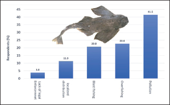 Fig. 3. Causes of Angel Shark decline based on Fisher’s opinion. The total length (TL) of the captured angel sharks ranged from 15 to 200 cm. The most frequently reported size class was 15–100 cm (64.2%), followed by 101–110 cm (18.9%) and 110–200 cm (17.0%). Fishers reported encountering Angel sharks most frequently over rocky-sandy substrates, followed by sandy bottoms. Among fishing gears, trawling was the most cited method associated with the capture of Angel sharks (43.2%), followed by bottom gillnets (35.8%) and longlines (20.9%) (Fig. 2). Perceived decline in Angel SharksAll respondents reported a perceived decline in Angel shark catches in recent years. The primary factors attributed to this decline included increased land-based marine pollution (41.5%), particularly untreated sewage along the Tripoli coast, which intensified over the past decade. Other contributing factors cited were overfishing (22.6%), destructive practices like dynamite fishing (20.8%), localized distribution of Angel sharks (11.3%), and insufficient enforcement of fisheries regulations (3.8%) (Fig. 3). Two fishers provided photographs of S. squatina specimens they had captured (Fig. 4).