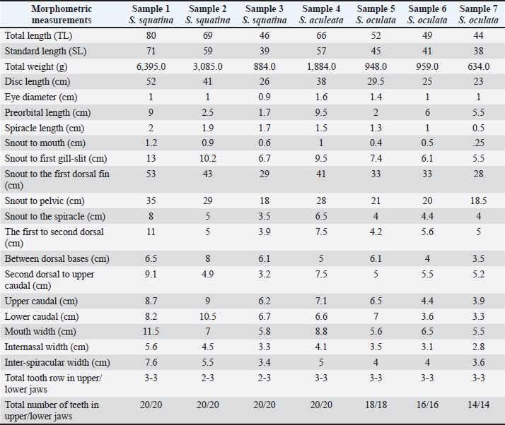 Variations in body proportions, such as the distance from the snout to the first dorsal fin and from the snout to the pelvic fin, were observed among the three species, reflecting interspecific differences in body morphology within the Squatina genus. S. squatina consistently exhibited larger body dimensions compared to the other two species. The number of tooth rows was relatively consistent among the species. Notably, all measured specimens were juveniles or sub-adults, suggesting that ongoing trawling activities disproportionately impact younger age classes and pose a significant threat to the population structure of these species. Table 1. Morphometric measurements of seven Angel shark specimens caught off the Tripoli coast, Libya.