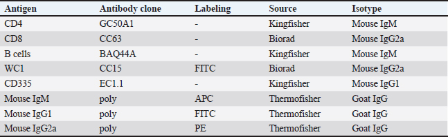 Fig. 1. Separated leukocytes were labeled with fluorescent antibodies and analyzed by flow cytometry. After the exclusion of cell doublets based on forward scatter aria (FSC-A) and forward scatter height (FSC-H) properties (A), viable cells were gated based on negative staining with propidium iodide (PI). (B), Subsequently, a gate was set on lymphocytes based on their FSC and side scatter (SSC) characteristics (C). The populations of CD4+ αβ T cells, CD8+ αβ T cells (D), BAQ44A+ B cells (E), NKp46+ (CD335), natural killer (NK) cells (F), and WC1+ γδ T cells (G) were identified. In addition, isotype control staining with mouse IgG1, IgM, and IgG2a secondary antibodies was performed (H-I).