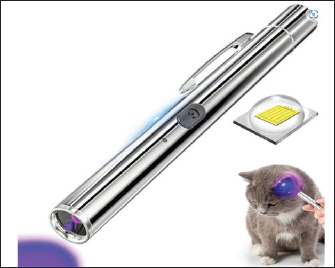 Fig. 1. Wood’s Lamp ultraviolet (U.V.) light pin. Following inoculation, the plates were incubated for 2 weeks at 27 °C. The plates were checked for fungal growth twice a week, and samples were deemed negative if there was no growth in week 4. The first step in identifying the cultures of the isolated dermatophytes was to examine their microscopic features and colony morphologies (macroscopically) on DTM. Dermatophytes create alkali chemicals that raise pH and turn the medium’s phenol red from yellow to red; thus, they were recognized by the change in DTM color from yellow to red. Lactophenol cotton blue stain (LPCB) and adhesive tape were used to identify the isolates. After coating the slide with LPCB, a sticky tape containing fungal structures was attached. Ethical approvalThis study was approved by the Ethics Committee of the College of Veterinary Medicine, University of Fallujah. ResultsConsidering the significance of M. canis infestation in cats and the level of damage they inflict, this study was conducted to determine the prevalence of M. canis in pet cats (Felis catus) in Ramadi and Fallujah Cities. More than 500 million cats are kept as pets worldwide because of their delicate nature, pleasant learning, and sense of essence (Seidensticker and Lumpkin, 2016). All examined cats showed positive results on Wood’s Lamp pin U.V. light examination (Fig. 3).