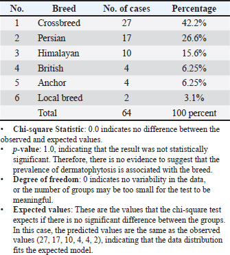 DiscussionThe results of the current study showed that the total infection rate of cat dermatophytosis was 47% (64 out of 136): Nweze (2011) also supported this high rate of prevalence in cats, and Esch and Peterson (2013) observed 58%–67% occurrence rate in their studies, (55.5%) (Murmu et al., 2015). In Kurdistan, Iraq, Jarjees and Issa (2022) discovered that M. canis was the most common isolate (95.24%) of dermatophytes from cats, with an isolated rate of 44.36%. One of the leading causes of dermatophyte infections in both humans and animals is the zoophilic dermatophyte Microsporum canis (Rad et al., 2018; Chupia et al., 2022). Other specialists believe that fungal skin infections in veterinary medicine are overdiagnosed (Moriello, 2004). Based on studies on the causes of skin diseases in cats using fungal cultures, the frequency of dermatophytes may be limited to all dermatological cases (Foil, 1990). Falahati et al. (2003) and Mattei et al. (2003) stated that M. canis is a dermatophyte that infects humans and animals by >60%. This study affirms that M. canis is the most frequent species of infection in cats and dogs, followed by M. gypseum and T. mentagrophytes (Bridhante et al., 2003) and Seker and Dogan (2011). Dermatophytosis infection was recognized to be more prominent in winter, with a prevalence of 39%, whereas it was less prominent in autumn, with a prevalence of 12.5%. These are statistically nonsignificant results at p < 0.05, as shown in Table 1. The chi-square statistic is zero, and the p-value is 1, indicating that there is no significant difference between the observed and expected distribution of cases across the seasons. Essentially, the prevalence of dermatophytosis does not vary significantly by season based on these data. The effect of season on the infection rate of dermatophytes was higher in winter and spring than in autumn. This could be related to the impact of the year season, climate, temperature, humidity, health of the cat, stress factors, number of spores, and hygiene on the prevalence of infection (Minnat and Khalf, 2019). Infection is significantly influenced by season. One factor that might increase the likelihood of dermatophyte infections is the wet winter months. Furthermore, weather variations significantly impact the cleanliness of cats’ bodies since owners refrain from walking their pets out of concern for diseases that might lead to skin infections or other abnormalities. The current results of the breed’s infection rates are in agreement with the previous study by Saleem et al. (2020), who found that a high prevalence of M. canis infestation was recorded in Persian cats, whereas the lowest prevalence of M. canis was recorded in the local breed (21.05%). Other researchers have found a higher prevalence in other breeds (Moriello and DeBoer, 1995; Cabañes et al., 1997; Puls et al., 2018). High infection rates were variable among different breeds because long-haired coat breeds trap more spores and have fungal-friendly environments than short-haired cats. Local breeds had the lowest prevalence because they are more immunologically competent than exotic breeds (Saleem et al., 2020). The effect of breed on this outcome may be explained by the aggressive behavior of males, which may cause injuries and abrasions of the skin, which is a predisposing factor to infections with dermatophytes (Frymus et al., 2013). However, the incidence of fungal skin infections in male and female cats did not differ significantly, according to research by Brilhante et al. (2003), Falahati et al. (2003), and Seker and Dogan (2011). Nonetheless, this result is consistent with a slightly greater prevalence of dermatophytoses in male cats, as Alpun and Ozgur (2009) described. In line with the findings of Falahati et al. (2003) (65.7% in males and 34.4% in females) and Ngwogu and Otokunefor, (2007) (29% in males and 1.4% in females), male patients were more affected than female patients. This may be because males are more likely to be associated with suffering pets. It is important that the rainy season has noticeably higher infection rates than other seasons because this corresponds with Falahati et al. (2003) and Maraki et al. (2012). According to the study, animals younger than one year were most impacted, which is consistent with other research (Minnat and Khalaf, 2019; Zaki et al., 2021). Moriello et al. (2017) reported that young animals are more vulnerable to dermatophytosis because of their immaturity, prior immunity, and skin microtrauma from ectoparasites or siblings. ConclusionAccording to the current study, fungal infections are most common in winter. M. canis is the main pathogen that infects vulnerable hosts of all ages. Therefore, taking appropriate precautions while caring for pets is important to reduce the risk of human infection. AcknowledgmentsSpecial thanks to the College of Veterinary Medicine, University of Fallujah. FundingNo funding. Author contributionMohammed Ali Hussein: Writing and editing. Khalid Ismael Oleiwi: practical work. Omar Attalla Fahad: sample collection. Conflict of interestThe authors declare no conflict of interest. Data availabilityData available upon request. ReferencesAasi, S.R. and Al-Aaraji, A.M. 2018. The inhibitory effect of Trichoderma harzianum CA-07 crude extract against Trichophyton mentagrophyte and Microsporium canis. Iraqi J. Sci. 1387–1395. Akpolat, N.O., Akdeniz, S., Elci, S., Atmaca, S. and Ozekinci, T. 2005. Tinea capitis in Diyarbakir, Turkey. Mycoses 48(1), 8–10. Ali, N.M. and Yassein, S.N. 2022. Isolation and identification of Microsporum Canis from pet animals of Baghdad Province. Proc. First Int. Conf. Adv. Res. Pure Appl. Sci. 2398, 1040044–1040048. Alpun, G. and Ozgur, N.Y. 2009. Mycological examination of Microsporum canis infection in suspected dermatophytosis of owned and ownerless cats and its asymptomatic carriage. J. Anim. Vet. Adv. 8(4), 803–806. Brilhante, R.S.N., Cavalcante, C.S.P., S
