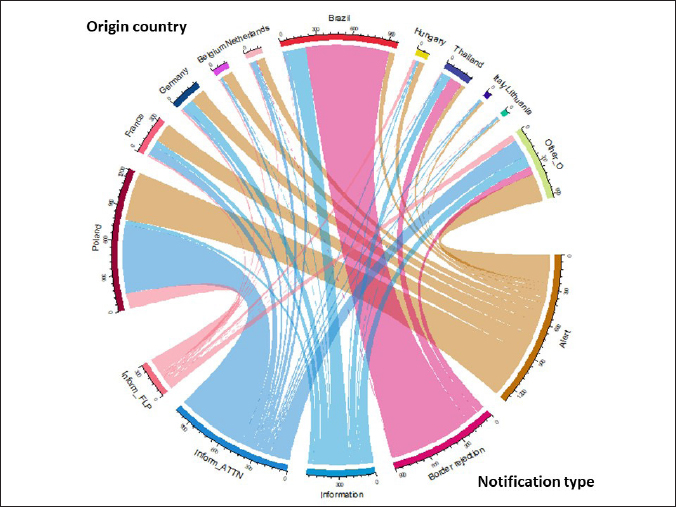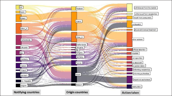 Fig. 3. Sankey diagram of notifying country versus originating country and action taken. Table 3. RASFF notifications based on pathogenic microorganisms and microbial contaminants in relation to origin countries.