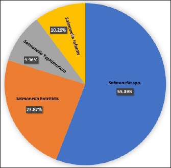 Fig. 4. Species of Salmonella identified in 3,170 RASFF notifications in poultry meat and poultry meat products originating from different countries around the world (including EU members) from 2000 to 2022. N.B. The total number of Salmonella (n=3,342) exceeded the total number of notifications (n=3,170) because of the co-occurrence of different Salmonella serovars. Of the 4,134 notifications, most were for poultry meat products originating from Poland (n=1,248), Brazil (n=997), France (n=339), Germany (n=280), and Thailand (n=242). The volume of trade concerning poultry products between these countries and the EU could be a major contributor to such notifications (European Commission, 2023a). In 2022 and 2023, Poland was the main poultry producer country in the EU (21% of total European poultry production), while France and Germany represented 11% of total poultry production in the EU (USDA, 2022) and (European Commission, 2023). Brazil is the main exporter of poultry products worldwide with 330–390 thousand tons in 2022–2023, while Thailand is the fourth exporter in the world, with around 50,000 tonnes in the same period (European Commission, 2023b). In 2018, a large proportion of European poultry imports were 30% from Brazil and 47% from Thailand (Chatellier, 2021). A more likely explanation for such notifications is the nature of the microbial and chemical hazards in the implicated poultry foods. The highest number of notifications reported by EU countries was in 2017. Pathogenic microorganisms, mainly Salmonella, increased among the most frequently reported pathogens in poultry meat products among member countries, as 1,136 notifications from Poland and also among non-member countries as Brazil caused 763 notifications of Salmonella in poultry meat mostly notified by the Netherlands, Germany, and the United Kingdom in addition to 142 notifications resulting from chicken meat from Thailand, which is compatible with previous reports (European Commission, 2017). Moreover, Campylobacter species and L. monocytogenes were shared among the microbial notifications by a minor percentage. In the same manner, residues of veterinary medicinal products, microbial contaminants, poor or insufficient controls, and feed additives represented a minor percentage of all notifications (11.1%). Risk management strategies are highly required to minimize pathogenic incidence in poultry meat, particularly for Salmonella spp., Campylobacter spp., and L. monocytogenes throughout the entire food chains among EU members (EFSA, 2012; Gonçalves-Tenório et al., 2018; Khalid et al., 2020). Proper hygiene and safety practices have been suggested as the main intervention for imported poultry meat products to comply with EU national market requirements (Jansen et al., 2018; Khalid et al., 2020). The highest number of notifications was reported by the Netherlands (14.88%). This is easily recognized because of the implementation of high standards for food quality and safety measurements in the Netherlands (Verbruggen and Havinga, 2015). Notifications made by the Netherlands mainly concerned poultry meat products originating from Brazil and Thailand. Food safety in Brazil has been a major challenge with huge impacts on public health due to inappropriate hygienic conditions and fewer establishments and policies to monitor and ensure the adequacy of food services (Lucca and Torres, 2006; Campos et al., 2009; Saccol et al., 2013; Cunha et al., 2014; Almeida Júnior et al., 2017). In Thailand, food safety programs, establishments, and guidelines need to be strengthened by the Thai government to reduce the huge impact of food safety defiance on public health, international trade, and economics (Takeuchi and Boonprab, 2006; Chaoniruthisai et al., 2018; World Health Organization, 2020). The highest number of notifications was for poultry meat and poultry meat products originating in Poland. This could be due to the leading poultry industry in Poland among EU countries (European Commission, 2023b). In contrast, Poland was the second country to report notifications related to poultry hazards. This could be due to the implementation of requirements for safety assurance in food production and hygiene in Poland (Trafiałek and Kołożyn-Krajewska, 2011). Table 4. RASFF notifications of variable hazards in poultry meat and poultry meat products (n=4,134) originating from different countries around the world (including EU members) from 2000 to 2022 based on the originating country.