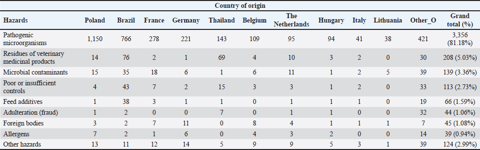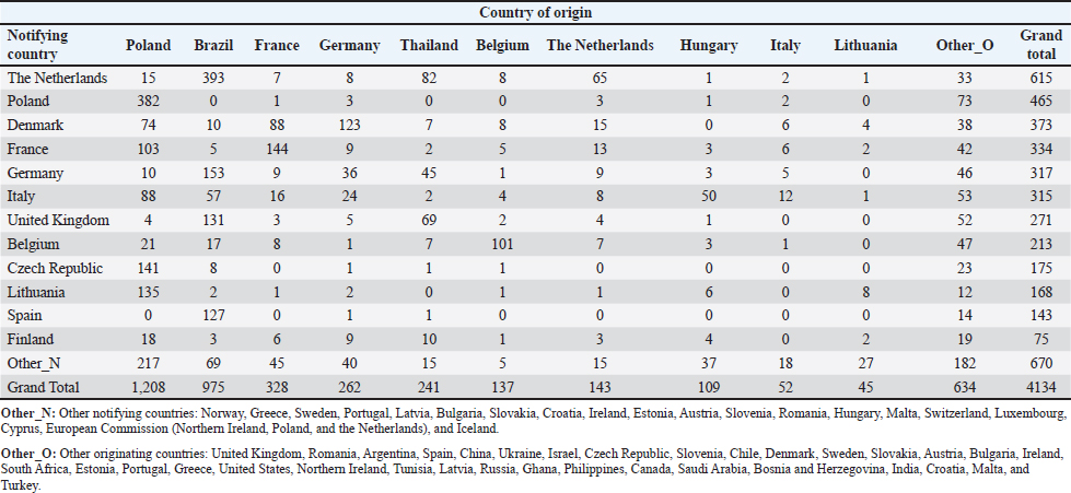AbstractBackground: The European Commission developed the Rapid Alert System for Food and Feeds (RASFF) as a monitoring and reporting tool for food safety risks and consumer protection among the European Union (EU) and the European Economic Area member states. Aim: This study evaluated the notifications of variable hazards on poultry meat and poultry meat products originating from global supply chains to the EU between 2000 and 2022 by analyzing notifications and alert incidences on the RASFF database. Methods: A total of 4,134 notifications were evaluated and analyzed, such studies were reported by 32 countries due to the presence of pathogenic microorganisms, residues of veterinary medicinal products, microbial contaminants, feed additives, and adulteration in addition to poor or insufficient controls from 48 countries worldwide. Results: The highest number of notifications was for poultry meat and poultry meat products imported from Poland (n=1,208; 29.22%) and Brazil (n=975; 23.58%). Among all reported notifications, pathogenic microorganisms were the most predominant (n=3,356; 81.18%) across the variable categories of hazards. Salmonella was the most notified pathogen (n=3,170; 76.68%). According to notification type, alert represented (31.88%), followed by border rejection (21.89%), and based on risk decisions, the vast majority of cases (54.26%) were considered as serious. The main measures taken in response to notifications were withdrawal from the market (12.62%) and import not authorized (11.46%). Conclusion: The results revealed that imported poultry meat and poultry meat products are potential vehicles for clinically relevant risks, including microbial and chemical hazards. Keywords: RASFF, Notifications, Poultry meat products, European Union. IntroductionWorldwide, poultry is the most consumed type of animal protein (OECD-FAO, 2021). According to Fuseini et al. (2023), poultry meat has a low-fat content, is more versatile, is inexpensive, and is easier to cook than other types of meat. In terms of global food imports, the European Union (EU) is ranked second (Jansen et al., 2018). Although international trade increases access to foods derived from animals, other countries worry about food safety breaches and the possibility of zoonotic infections (Attrey, 2017). Numerous elements, such as chemical pollutants and biological dangers, may render food unsuitable for human ingestion (Borchers et al., 2010). The number of incidents of food poisoning has been increasing in recent years worldwide; in fact, experts estimate that 600 million people get sick from food poisoning every year. Every year, over 23 million cases of food poisoning cause 4,500 fatalities and over 400,000 disability-adjusted life years in Europe. The transmission of pathogenic microorganisms such as Salmonella spp., Campylobacter spp., and Listeria monocytogenes can be facilitated by poultry meat and poultry products, according to epidemiological studies (Gonçalves-Tenório et al., 2018; European Food Safety Authority and European Center for Disease Prevention and Control, 2019). The majority of salmonellosis infections, whether sporadic or spillover, originate from poultry (Pires et al., 2011). The European Food Safety Authority identified Salmonella spp. as a pathogen of high concern when inspecting poultry flesh (EFSA, 2012). In addition, according to EFSA (2010), poultry is a common source of Campylobacter spp., which pose a foodborne risk. This is mostly due to cross-contamination with ready-to-eat foods. Approximately 20%–30% of human Campylobacteriosis cases are thought to be caused by broiler meat in some way, shape, or form; however, 50%–80% of these cases may be associated with the entire chicken as a reservoir (EFSA, 2012). According to Gonçalves-Tenório et al. (2018), poultry and other ready-to-eat meals are common sources of listeriosis. There is a need to consider the potential danger to public health posed by chemical pollutants, veterinary product residues, and illegal substances found in food products. Bouzembrak and Marvin (2016) cited food theft as another cause for rejecting EU-delivered food. In addition, between 1998 and 2015, the EU listed the presence of foreign entities in food items as a reason for rejection (Djekic et al., 2017). The EU is a key hub for all its commercial partners throughout the globe. Between 2000 and 2018, there was relatively little change in the percentage of agrifood commerce involving animal products, which accounted for 16% of the overall trade (Chatellier, 2021). This percentage did not include trade within the EU. With 23% of the world’s total exported animal products, the EU is by far the top exporter. The majority of the world’s meat supply comes from chicken and other poultry. In recent years, the United States has been the leading producer, followed by China (16.3%), Brazil (10.9%), and the EU (12.0%), according to data compiled by the Food and Agriculture Organization (FAO) and the Organization for Economic Co-operation and Development (OECD), 2020. In their 2020 forecast, the OECD and the FAO predicted that global poultry meat supplies would rise by 20.3 million tons from 2019 to 2029. According to Chatellier (2021), the top nations in the world that import chicken meat are Japan (16%), the EU (11%), China (10%), Saudi Arabia (5%), and Mexico (5%). The EU is the world’s second largest food importer; therefore, it is crucial that everything that comes into the country meets the stringent quality requirements set by the EU (Jansen et al., 2018). That is why rules and regulations have to be in place for animal products to be imported into the EU from outside the EU. The European Commission developed the Rapid Alert System for Food and Feeds (RASFF) as a notification and monitoring tool. It is an online platform that gathers datasets linked to food safety for EU members. This paves the way for EU and European Economic Area nations to address fo