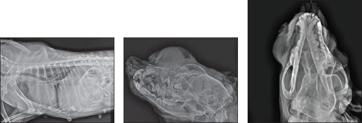 Fig. 3. X-ray showing osteolytic expansile lesion proliferative periosteal reaction irregular margin and stippled to speculated columnar periosteal reaction. The frontal bone, nasal bone, and maxilla depicted gross destruction. These are features of aggressive bone lesions. The differential diagnosis included multiple myeloma, Osteoma, Squamous cell carcinoma, malignant melanoma, acanthomatous ameloblastoma, and fibrosarcoma. Biopsy sample obtained from the rostral aspect of the mass shows cartilaginous tissue in the center of the tumor, and the chondrocytes are normal. There was no malignant tumor, and the pathological assessment showed a histiocytoma. Surgical approach was performed to remove the expansile tumor (Fig. 4 Post-op), general anesthesia was induced by ketamine-Diazepam (5 mg.kg-1, 0.5 mg.kg-1) and Isoflurane maintenance by 3% MAC (minimum alveolar concentration).