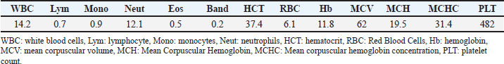 Fig. 1. Gross images of the mass in the right frontal and nasal region (Pre-operation). On the left side, only the left nasal region was involved. The initial blood parameters are listed in Tables 1 and 2. Cytology was performed with fine needle aspiration by extraction sampling using needle 18-gauge diameter. Table 1. CBC (cell blood count).