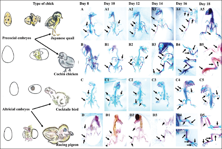 Fig. 4. Skeletogenesis of precocial, including Jq embryos (A-A5) and Cc embryos (B-B5) and altricial, including Cb embryos (C-C5) and Rp embryos (D-D5) illustrates the area of ossification in the embryo subjected to double staining with (AB) for chondrification and (AR) for ossified bones on days 8, 10, 12, 14, 16, and 18 of the incubation period. The ulna, radius, and humerus initiate ossification on day 8 in all embryos, except Cc embryos on day 10. The small, reddish-stained center near the diaphysis is the ossified portion (black arrows). Staining showed intense staining of the embryonic skeleton on the 18th day of incubation. The ulna, radius, and humerus ossify in the FL, whereas the femur and tibia form in the HL. Histological studyThe findings showed that by day 8, the hypertrophic zone was characterized by larger chondrocytes situated in the middle of the diaphysis and on each side of the hypertrophic zone. These results correspond with those of Zorab and Salih (2021), who reported that ossification in the humerus occurred on the 8th day. However, Nakane and Tsudzuki (1999) and Nishimura et al. (2012) reported that the first ossification center of these bones was observed on day 7. Additionally, Pourlis and Antonopoulos (2011) documented an extraordinary early ossification of these bones on the sixth day. However, these indicate potential species variance within the same genus, or that discrepancies in these data may be attributable to factors such as strain, health, age, diet, and management. The inner cellular layer of the perichondrium differentiated into osteoblasts by the 8th day in all experimental skeletal tissue embryos, which is analogous to those published by Zorab and Salih (2021), who indicated that an intramembranous process immediately ossified the slender U-shaped clavicles on day 9. Some studies such a, such Pourlis and Antonopoulos (2011), and Nakane and Tsudzuki (1999), stated were conducted seventh and eighth days, respectively. The first phalanx of the first digit remained cartilaginous during preaching, a conclusion corroborated by Zorab and Salih (2021) in quail. Throughout the 10th day of incubation distinctly identified the condensation cells inside the deep avascular layer of the mesenchyme, noting a central core of rounded cells encircled by a layer of elongated cells. These results correspond with the work of Ahmed and Soliman (2013), who noted morphological alterations at this stage, characterized by enlargement and rounding of the cell body, whereas the cells inside the aggregate displayed traits of osteoprogenitor cells. Kürtül et al. (2009) previously showed that these cytological alterations lead to developed osteoblasts that release collagen and osteoid. The inner cellular layer of the perichondrium differentiated into osteoblasts by the 10th day in all embryos of Cb, Rp, Jq, and Cc, on 12th days, the mid-diaphysis area, where the chondrocytes had hypertrophied, the osteoblasts deposited osteoid tissue, forming a bone collar, and the progressive transformation of the perichondrium into the periosteum. This observation is consistent with the findings of Wu et al. (2022), who highlighted similar alterations in quail embryos over 10 days. The developed normal osteoblasts secrete a matrix that isolates rounder cells from one another in the middle region of the condensation. The matrix was osteoid, and the cells produced were osteoblasts. This suggests that throughout bone tissue creation, osteoblasts produce and deposit type 1 collagen, the principal protein component of the bone matrix (Shapiro, 2008). Additionally, Pourlis et al. (1998) stated that the newly formed tissue undergoes vascularization, and the aggregated mesenchymal cells enlarge and become rounder, signifying that the cytological alterations lead to the differentiation of osteoblasts, which release collagen and osteoid matrix. On 14th day of incubation, osteoblasts were significantly augmented, and the deposition of the periosteal bone collar around the mid-diaphysis increased its thickness toward the center of the diaphysis. This finding is inconsistent with the observations of Pourlis and Antonopoulos (2011) and corresponds with the study of Li et al. (2024), which demonstrated that osteoblasts not only generate osteoid matrix but also significantly contribute to its mineralization. This suggests that mature osteoblasts anchored inside the matrix differentiate into osteocytes. The ossification of the phalanx was observed on the 14th day, in contrast to Nakane and Tsudzuki et al. (1999) in Jq, who noted it on the 16th day. On the 16th day, mature osteoblasts were lodged in the matrix and differentiated into osteocytes, resulting in the formation of primary woven bone. Calcification of trabecular bone. The endochondral bone trabeculae continued to synthesize until they fused with the periosteal bone collar, encompassing the whole middiaphysis of the humerus and establishing the principal ossification center (Wu et al., 2022). Chondrocytes mineralize their surrounding matrix, providing a framework for the production of trabecular bone. They can also induce a bone collar, which is the precursor to cortical bone, in the neighboring perichondrium (Blumer, 2021). Shapiro (2008) reported that the collar gradually extended toward the proximal and distal epiphyses of long bones, ultimately encompassing the whole new bone. These findings suggest that ultimately, cartilage rods undergo erosion and alteration, resulting in the formation of the medullary cavity. Zorab and Salih (2021) reported that as the osteoid collar expands towards the ends of the long bone, the middiaphysis undergoes additional mineralization and converts into lamellar bone. Additionally, Li et al. (2024) reported that the long bones of the limbs undergo radial growth in the diaphysis. This expansion of growth occurs in the cortical bone via the formation of osteoblasts in the innermost coating of the periosteum (Al-Agele 