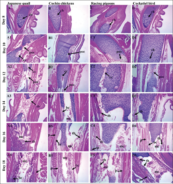 Fig. 5. A photomicrograph images of H & E stained tissue sections showing skeletogenesis of limb embryos, (A-A5) Jq embryos, (B-B5) Cc embryos, (C-C5) Rp embryos, (D-D5) Cb embryos, of 8, 10, 12, 14, 16, and 18-day-old embryos. The hypertrophy zone, characterized by larger chondrocytes (ch) and associated with the formation of the cartilage canal (cc), primary ossification center was located in the center of the diaphysis, Cartilage canal (cc); as the embryo progressed, the trabecular bone (tb) and bone collar (bc) forming in the center the medullary cavity (mc), these bony structures started to become visible, which were surrounded externally by the periosteum (p). (10×, H&E). ConclusionIn conclusion, the present study provides histomorphometric data that reveal distinct patterns of embryonic skeletogenesis in precocial (Jq and Cc) and altricial (Rp and Cb) embryos. Morphometric examination of the ossified segments of the femur and humerus revealed that the length of the ossified region increased during the incubation period. The variations in ossification and chondrification were particularly evident in Jq. All bones in the FL and HL were ossified during incubation, except the patella. These findings may have practical implications, highlighting that HLs develop more rapidly than FLs in quail and other precocial embryos. Comparative embryological investigations across many species and features have assembled considerable data on the timing of initial developmental events. To examine and comprehend the data gathered in this study, these statistics are crucial indicators and elements. AcknowledgmentsThe authors extend their gratitude to the College of Veterinary Medicine, University of Diyala. Conflict of interestThe authors confirm that they have no conflicts of interest. FundingThis project was not supported by grants. Authors’ contributionIMA: Writing original draft; RAA: supervision, conception, validation, writing, reviewing the manuscript. Data availabilityThe data supporting this article’s results are available in the manuscript and from PMN upon reasonable demand. ReferencesAhmed, Y.A. and Soliman, S.A. 2013. Long bone development in the Japanese quail (Coturnix coturnix japonica) embryos. Pak. J. Biol. Sci. 16(18), 911–919; doi:10.3923/pjbs.2013.911.919 Al-Agele, R. 2020. The study of histological observations of ovine claw coronary region and the architecture morphology of arterial anastomosis of this area. Atatürk Univ. J. Vet. Sci. 15(1), 14–21; doi:10.17094/ataunivbd.634782 Al-Agele, R.A. 2024. Comparative histomorphometrical study of the lamellae in odd-toed and even-toed ungulate animals. Iraqi J. Vet. Sci. 38(3), 701–706; doi:10.33899/ijvs.2024.148208.3565 Al-Agele, R.A.A., Jabbar, A.I. and Al-Ubaidy, A.A.H. 2021. Study on morphohistological observations of the islets of langerhans in the pancreas of common wood pigeon Columba palumbus. Biochem. Cell. Arch. 21(1), 1165–1170. Al-Agele, R., Paul, E., Taylor, S., Watson, C., Sturrock, C., Drakopoulos, M., Atwood, R.C., Rutland, C.S., Menzies-Gow, N., Knowles, E. and Elliott, J. 2019. Physics of animal health: on the mechano-biology of hoof growth and form. J. R. Soc. Interface. 16(155), 1–12; doi:10.1098/rsif.2019.0214 Augustine, S., Lika, K. and Kooijman, A.M. 2019. Altricial-precocial spectra in animal Kingdom. J. Sea Res. 143, 27–34; doi:10.1016/j.seares.2018.03.006 Blumer, M.J. 2021. Bone tissue and histological and molecular events during development of the long bones. Ann. Anat. 235, 151704; doi:10.1016/j.aanat.2021.151704 Chan, W.C., Tan, Z., To, M.K. and Chan, D. 2021. Regulation and role of transcription factors in osteogenesis. Int. J. Mol. Sci. 22(11), 5445; doi:10.3390/ijms22115445 Dial, T.R. and Carrier, D.R. 2012. Precocial hindlimbs and altricial forelimbs: partitioning ontogenetic strategies in Mallard ducks (Anas platyrhynchos). J. Exp. Biol. 215, 3703–3710; doi:10.1242/jeb.057380 Gao, J., Li, X., Zhang, Y. and Wang, H., 2018. Endochondral ossification in hindlimbs during Bufo gargarizans metamorphosis: a model of studying skeletal development in vertebrates. Dev. Dyn. 247(10), 1121–1134; doi:10.1002/dvdy.24669 Gillian, D.M. 2000. Early ontogeny of locomotor behaviour: a comparison between altricial and precocial animals. Brain Res. Bull. 53(5), 719–726; doi:10.1016/S0361-9230(00)00404-4 Ikeda, K. and Takeshita, S. 2016. The role of osteoclast differentiation and function in skeletal homeostasis. J. Biol. Chem. 159(1), 1–8; doi:10.1093/jb/mvv112 Kadhim, T.J., Al-Agele, R.A.A. and Ibrahim, R.S., 2023. Histopathological study of the cecal tonsils post newcastle vaccine in broiler chickens. AIP Conf. Proc. 2475(1), 100008; doi:10.1063/5.0103023 Kürtül, İ., Atalgin, Ş.H., Arslan, K. and Bozkurt, E.Ü. 2009. Ossification and growth of the bones of the wings and legs in prehatching period of the Hubbert strain broiler. Kafkas Univ. Vet. Fak. Derg. 15(6), 869–874; doi:10.9775/kvfd.2009.176 Li, X., Zhang, Y. and Zhao, H. 2024. Endochondral ossification of hind limbs in embryonic development of Japanese Quail (Coturnix japonica). Avian Res. 15, 100152; doi:10.1016/j.avrs.2023.100152 McGuire, R.S., Ourfalian, R., Ezell, K. and Lee, A.H. 2020. Development of limb bone laminarity in the homing pigeon (Columba livia). PeerJ 8, e9878; doi:10.7717/peerj.9878 Nakamura, Y., Nakane, Y. and Tsudzuki, M. 2019. Skeletal development in blue-breasted quail embryos. Anim. Sci. J. 90(3), 353–365; doi:10.2741/4076 Nakane, Y. and Tsudzuki, M. 1999. Development of the skeleton in Japanese quail embryos. DGD 41(5), 523–534; doi:10.1046/j.1440-169x.1999.00454.x Nasser, A.T., Al-Azzawi, A., Al-Agele, R. and Al-Ajeeli, K. 2024. Identification of extremely virulent infectious bursal disease virus via molecular and histological methods in broiler chickens. JWPR 14(1), 98–112; doi:10.36380/jwpr.2024.10 Nie, C.H., Wan, S.M., Liu, Y.L., Liu, H., Wang, W.M. and Gao, Z.X. 2019. Development of teleost intermus