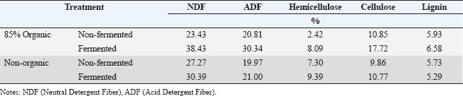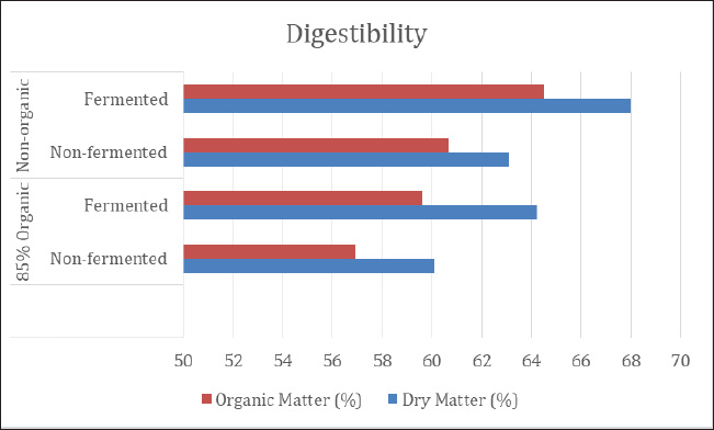Silage preparationRation fermentation was carried out using the StarBio® starter and incubated for 21 days at room temperature and humidity for the fermented organic and non-organic groups (Fang et al., 2020). The length of fermentation was 21 days in this research because StarBio® has been proven to be effective in increasing in-vitro dry matter digestibility (DMD) and in-vitro organic matter digestibility (OMD) (Fadhlullah, 2021; Marlida et al., 2023). For the experiment, each formulation was prepared in a 1-kg bag and fermented for 21 days. The amount of StarBio® used was 125 g for each kilogram of feed formulation. Each treatment was repeated four times. Nutrient content analysisNutrient content was analyzed by proximate analysis, which consisted of water, DM, ash, organic matter (OM), crude protein (CP), crude lipid (CL), fiber, and ether extract content. The water and ash contents were analyzed by the gavimetric method (Holik et al., 2019). Water content was analyzed by putting 100 g of sample in a 60 °C oven, CP content was analyzed by the Kjeldahl method, and CL content was analyzed by the Soxhlet method (Holik et al., 2019). Nutritional content and fiber profile were analyzed by the proximate and Van Soest analysis method (Hudaya et al., 2018). Analysis of digestibility and rumen environmental conditionsIn vitro techniques using rumen inocula were used to estimate total digestibility values and environmental conditions (Russouw et al., 2016). Determination of DMD was conducted after 48 hours of incubation. The content of each in vitro tube was filtered using a sintered glass tube and vacuum. The incubation residue was heated at 105°C for 24 hours to calculate the DMD and OMD. The supernatant was sampled for the analysis of VFA, ammonia (NH3), and pH. The concentration of individual VFAs was analyzed by [gas liquid chromatography Scion Bruker 436-gas chromatography (GC), Bruker Daltonik GmbH, Bremen, Germany] using a column (BR-Wax fame, mmlD 0.32, 0.25 ml df) and FID detector. The ammonia concentration was analyzed according to the method of Conway (1950). The pH value was measured using a pH meter. Pesticide residue contentAnalysis of pesticide residue was conducted using GC) with a flame photometric detector (Zhao et al., 2014). Data analysisAll data were analyzed and reported quantitatively and descriptively in tables and discussions. Ethical approvalThis study did not involve any animals. This study focused on the fermentation of animal feeds collected from organic and non-organic sources, and analyzed their nutritional values in the laboratory. The rumen liquid used in this study was collected from a slaughterhouse in Bondowoso, Indonesia. ResultsThe data on nutrition content are presented in Table 3, fiber profiles are presented in Table 4, digestibility is presented in Figure 1, rumen environmental conditions are presented in Table 5, and pesticide residue contents are presented in Table 6. Table 3. Nutrient content of treatment rations.
