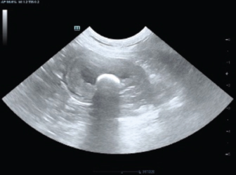 Fig. 1. Ultrasonographic image demonstrating hyperechoic urolith measuring 1.11 × 0.61 cm.