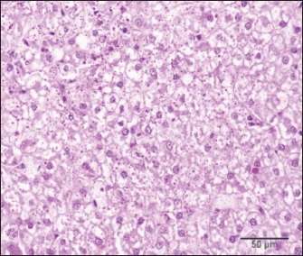 Fig. 5. Liver dog: numerous PAS-positive glycogen droplets in the cytoplasm of neoplastic cells. PAS, 40×. The patient was found to have good general health and behavior 3 months post-surgery. DiscussionCCHCC is a rare variant of HCC in dogs. The condition is characterized by hepatocytes with clear cytoplasm due to glycogen or lipid accumulation (Jung et al., 2021). Although HCC is the most prevalent primary liver tumor in dogs, comprising up to 77% of primary hepatobiliary neoplasms (Patnaik et al., 1981), reports on the clear cell variant are scarce. Therefore, the current understanding of CCHCC clinical behavior, prognosis, and treatment options in dogs remains limited. Jung et al. (2021) reported an 11-year-old obese dog with hyperlipidemia who exhibited no apparent clinical signs of disease. Subsequently, the dog was diagnosed with CCHCC after detection of a liver mass. Obesity and hyperlipidemia are potential risk factors for CCHCC in dogs (Jung et al., 2021). In the present case, a hepatic mass was incidentally detected during an ultrasound examination of the abdominal cavity, which was conducted as part of the evaluation of the primary complaint of urinary system issues. In contrast to the case reported by Jung et al. (2021), obesity and hyperlipidemia were absent, necessitating further investigation to identify the risk factors associated with CCHCC. In our case, based on anamnestic data, the only prominent concurrent disorder observed was severe AD, which was treated over an 8-year period using oclacitinib, cyclosporine, corticosteroids, and lokivetmab. AD is a prevalent chronic inflammatory skin disease in dogs. It is characterized by dysregulated immune responses and systemic cytokine release. Chronic inflammation is a known contributor to cancer development across species. In humans, links between immune-mediated disorders and hepatic carcinogenesis have been attributed to persistent inflammatory signaling (Sasco et al., 2004). In comparison, recent recentings of Wan et al. (2023) suggest a lack of substa substantialelation between AD and malignant tumor. However, the findings exhibited variations across age groups, severity of AD, and specific cancer types. There is no strong, consistent evidence directly linking AD and HCC; however, some studies have explored potential indirect correlations through shared inflammatory and immunological pathways, as well as overlapping risk factors. Chronic systemic inflammation in AD, marked by elevated interleukins such as IL-6, IL-17, IL-22, and IL-33 expression, is also implicated in HCC progression. These cytokines are known to influence tumor development and may bridge inflammatory skin disorders with liver carcinogenesis (Huang et al., 2023; Laska et al., 2024). Furthermore, the presence of IL-22-producing cells in the tumor microenvironment is correlated with poor outcomes in HCC (Laska et al., 2024). The potential correlation between AD and malignant tumor in dogs has not yet been investigated. Regarding the anamnestic data, no other remarkable findings or concurrent disorders were observed. HCC in dogs is histopathologically classified into three main architectural patterns: trabecular, pseudoglandular, and solid, based on the structural arrangement of tumor cells and their resemblance to normal hepatic tissue. A rarer subtype, the clear cell variant, is characterized by tumor cells with clear cytoplasm due to glycogen or lipid accumulation. Although histologically distinct, its biological behavior in dogs remains poorly understood due to the limited number of documented cases (Patnaik and Hurvitz, 1980; Liptak et al., 2004; Jung et al., 2021). Human studies have demonstrated that a specific cell population within hepatic tumors can be utilized for survival time prognosis. A higher proportion of clear cells within the CCHCC is associated with a more favorable prognosis, with patients exhibiting longer survival rates when clear cells constitute ≥70% of the tumor (Chen et al. 2016; Chen et al., 2016; Deng et al., 2021). Similar investigations are lacking in veterinary medicine. Histopathological classification not only aids in distinguishing HCC from other hepatic neoplasms, such as biliary carcinoma and metastatic tumors, and provides prognostic value. For instance, well-differentiated trabecular HCCs are associated with better prognosis, particularly when they are confined to a single liver lobe and amenable to surgical excision (Liptak et al., 2004). Surgical resection remains the cornerstone of HCC treatment in dogs, including rare subtypes like CCHCC. Although general data on massive HCC provides a strong foundation for understanding the potential outcomes of surgical therapy, specific information on CCHCC is scarce, limiting definitive conclusions regarding prognosis. In their study of 48 cases of massive HCC, Liptak et al. (2004) reported that surgical excision resulted in a median survival time exceeding 1,460 days in dogs with complete tumor resection. Recurrence was rare, suggesting that HCCs, even in large and invasive forms, often demonstrate low metastatic potential when resected entirely. Although no specific survival data are available for CCHCC, the tumor’s presumed similarities in behavior to other HCC variants suggest that timely surgical removal may yield comparable outcomes. Incomplete excision or the presence of metastases at the time of diagnosis can worsen outcomes. However, considering that CCHCC cases often present with nonspecific signs leading to delayed diagnosis, early surgical intervention is particularly challenging. In this case, the hepatic mass was incidentally identified during the examination of the primary complaint of urinary tract issues. The general survival times of dogs with CCHCC are virtually nonexistent because of the limited number of documented cases. In our case, the owners were informed about the absence of robust survival time data and were provided with a prognosis based on a s