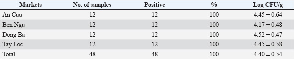 ABSTRACTBackground: Staphylococcus aureus is an opportunistic pathogen widely present in humans and food-producing animals. The emergence of antimicrobial resistance (AMR) in S. aureus represents a major challenge for both animal and public health. Aim: This study investigated the presence of S. aureus in pork sold in traditional markets in Central Vietnam, analyzing its AMR profile and evaluating potential public health risks. Methods: We collected 48 retail pork samples from traditional markets in Central Vietnam. The S. aureus count (log10 CFU/g) was determined using Baird–Parker (BP) medium and was confirmed by the coagulase reaction. The S. aureus isolates were tested for AMR and AMR genes (ARGs) using the disk diffusion method and PCR, respectively. Results: All 48 retail pork samples (100%) tested positive for S. aureus, with S. aureus counts ranging from 4.17 to 4.52 log10 CFU/g. AMR was most commonly observed against penicillin (75.0%), followed by amoxicillin (64.6%), tetracycline (54.2%), ampicillin (41.7%), neomycin (39.6%), and vancomycin (39.6%). Multidrug resistance was observed in 85.4% of the S. aureus isolates, with penicillin–ampicillin–amoxicillin being the most common resistance pattern. The highest frequency of S. aureus isolates carried the tetM (30/48, 62.5%) gene, followed by blaZ (25/48, 52.1%), and femA (20/48, 41.7%). Moreover, the results revealed a positive correlation among β-lactams, specifically between ampicillin and neomycin, and between amoxicillin and erythromycin/neomycin. Conclusion: The high AMR of S. aureus isolates from retail pork samples is alarming and raises public health concerns. Food of animal origin serves as a source of AMR S. aureus, which can spread throughout the food supply chain. Therefore, controlling S. aureus requires targeting specific entry points based on findings related to risk factors and food contamination drivers. Keywords: S. aureus, Retail, Antimicrobial resistance, Vietnam, Market. IntroductionGlobal average annual meat consumption is approximately 15 kg per person for pork, 12.6 kg for poultry, and 9.6 kg for beef. In Europe, these figures are considerably higher, with per capita consumption reaching 34.2 kg for pork, 21.9 kg for poultry, and 16.1 kg for beef (World Health Organization, 2022). Pork is the most popular type of meat in Vietnam, accounting for around 73% of all meat consumption (Nguyen et al., 2006). A steady growth of per capita pork consumption was observed in the country, rising from 8.1 kg/capita/year in 1990 to 31.3 kg/capita/year in 2018 (Organisation for Economic Co-operation and Development, 2018). In 2023, pork production amounted to 3.8 million tons, an increase of 2.2% compared with 2017 (Vietnam Livestock Production, 2022). Nevertheless, food safety remains a major concern in Vietnam, which carries a high burden of foodborne illnesses, particularly those linked to pork products (Nguyen et al., 2020). Approximately 80% of pork in Vietnam is produced by smallholders, with processing and distribution occurring primarily through informal market channels, such as open-air and traditional markets (Lapar and Tiongco, 2011). Retail pork is frequently contaminated with biological hazards such as E. coli, Salmonella, Staphylococcus aureus, Streptococcus suis, and chemical hazards (Cook and Phuc, 2019). This widespread contamination contributes to the high burden of foodborne illnesses. Staphylococcus aureus is a major foodborne pathogen in fresh and processed products and is responsible for a wide range of infections worldwide (Diep et al., 2006). Staphylococcus aureus is widely distributed, but food is its most important source of infection. After Salmonella and Campylobacter, the two most common bacteria associated with food poisoning, S. aureus is the third most common foodborne pathogen, identified in approximately 241,000 cases globally per year (Wu et al., 2018a). In 2013, S. aureus caused 12.5% of all foodborne bacterial outbreaks in China (Wei-Wei et al., 2018). In Vietnam, 677 foodborne outbreaks involving 21,002 patients were recorded during the four years from 2011 to 2014 (Hung et al., 2020). The most frequent source of infection among Staphylococcal species is S. aureus, a facultatively aerobic Gram-positive bacteria. It is a component of the skin’s and the nasal mucosa’s microbiota. Nearly 20% of the general population is consistently positive for S. aureus, and this percentage can reach 80% in healthcare workers, frequent needle users, hospital patients, and people with compromised immune systems (Boucher and Corey, 2008; Foster and Geoghegan, 2023). Human and animal infections (zoonotic) caused by the bacteria S. aureus typically manifest as impetigo, pus-filled abscesses, swelling, discomfort, and pus-filled redness on the skin (Wertheim et al., 2005, 2009). Serious symptoms, such as fever, chills, and low blood pressure, might arise if the bacteria enter the bloodstream and cause sepsis. Myocarditis, pneumonia, osteomyelitis, and mastitis can all be caused by bacteria (Squier et al., 2002). Bacteria can cause serious infections when they reach the blood, leading to shock, multiple organ failure, or even death (Igbinosa et al., 2016). Food poisoning is a condition that can cause vomiting and fever in individuals who consume contaminated food containing S. aureus (Thompson and Brown, 2014). Over the past few decades, the widespread use of antimicrobials (AMs) to treat infectious diseases has contributed to the emergence of multidrug-resistant (MDR) strains, posing major challenges to public health (Ahmed et al., 2024). As a highly adaptable pathogen, S. aureus can survive in various environmental conditions and rapidly develop resistance to most AMs (Velasco et al., 2022). Currently, an increasing number of MDR S. aureus strains have been reported in food poisoning outbreaks and isolated from food products (Papadopoulos et al., 2018; Dorjgochoo et al., 2023). Furthermore, met