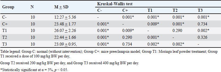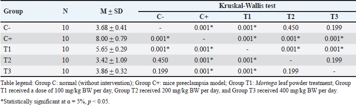 C-Reactive ProteinC-reactive protein is an acute-phase reactant protein produced by the liver in response to inflammation and is often associated with infections and chronic diseases. The level of ILs serves as an indicator of inflammatory processes that affect overall health (Nehring et al., 2023). Anti-Qa2 exposure elevates CRP levels, with the highest levels recorded in the T1 treatment group (3.12 ± 0.28). Moringa oleifera supplementation significantly reduced these levels, with the lowest CRP concentrations observed in the T3 treatment group (2.64 ± 0.17, p < 0.05) (Hikmah et al., 2019). This study’s findings are consistent with earlier research conducted by Hikmah et al. (2019) thereby substantiating the notion that in instances of preeclampsia, placental hypoxia conditions serve as a catalyst for an augmentation in CRP levels. CRP, in turn, has been identified as a pivotal instigator of the inflammatory response characteristic of preeclampsia. The study results further demonstrate that Moringa leaves have the capacity to attenuate CRP levels in the context of inflammation. Conversely, a study by Nuruhudin et al. (2020) found that M. oleifera leaf extract did not significantly lower high-sensitivity C-reactive protein levels in patients with systemic lupus erythematosus, despite a notable reduction in the MEX SLEDAI score (Nurudhin, 2020). AlbuminuriaUrinary protein levels serve as a clinical marker of endothelial dysfunction, a key factor in the development of preeclampsia. Exposure to anti-Qa2 increased albuminuria, with the highest levels observed in the C+ treatment group (8.00 ± 0.79) (Sakowicz, 2022). Moringa oleifera supplementation significantly reduced albuminuria caused by anti-Qa2 exposure, with the lowest levels found in the T2 treatment group (3.42 ± 1.09, p < 0.05) Sulistyowati (2025). Similarly, Akinrinde et al. (2024) reported that M. oleifera effectively mitigated oxidative stress by reducing MDA, protein carbonyls, and advanced oxidation protein products, while also lowering serum blood urea nitrogen and creatinine levels (Lingam, 2024). The present study demonstrated a substantial reduction in albuminuria levels in mice subjected to a preeclampsia model as a consequence of Moringa leaf administration. This finding aligns with the conclusions of several previous studies. Moringa has antioxidant properties that facilitate the repair of endothelial damage to the glomerulus, resulting in reduced albuminuria levels. A key limitation of the present study was the absence of a rigorous examination of kidney histology to ascertain any enhancements in kidney function. This investigation focused solely on albuminuria levels as a marker of ameliorating preeclampsia. ConclusionThe findings of this study indicate that the ethanol extract of M. oleifera leaves exerts a therapeutic effect against preeclampsia-associated symptoms. It is anticipated that this will emerge as a novel therapeutic option for this condition, with the potential to reduce maternal and fetal morbidity and mortality. The therapeutic effect of the administration of M. oleifera ethanol extract to mice model preeclampsia was demonstrated by a decrease in MDA and CRP levels in blood serum and albuminuria. AcknowledgmentsThe authors extend their sincere gratitude to the Embryology Laboratory, Faculty of Veterinary Medicine, Universitas Airlangga, for their invaluable support during this research. Conflict of interestThe authors declare no conflicts of interest related to this study. FundingThis research received no specific grant. Author’s contributionNutria Widya Purna Anggraini provided the contribution of all authors at submission, designed the analysis, performed the analysis, contributed data, and wrote the paper. Sri Sulistyowati conceived and designed the analysis, Soetrisno designed the analysis, Bambang Purwanto designed the analysis, and Paramasari Dirgahayu performed the analysis. Data availabilityAll data supporting the findings of this study are available in the manuscript. ReferencesAhmad, S., Pandey, A.R., Rai, A.K., Singh, S.P., Kumar, P. and Singh, S. 2023. Moringa oleifera inhibits protein glycation and exerts renoprotective effects in streptozotocin-induced diabetic rats. J. Ethnopharmacol. 305, 116–117. Akpan, H.B., Akande, A.A., Ojewale, A.O., Oladipupo, F.E., Akinpelu, O.F. and Jimoh, S.O. 2018. Moringa oleifera ameliorates nephropathic changes in alloxan-induced diabetic adult wistar rats. Afr. J. Health Sci. 6, 110–118. Batmomolin, A., Ahsan, A., Wiyasa, I.W.A. and Santoso, S. 2020. Ethanolic extract of Moringa oleifera leaves improve inflammation, angiogenesis, and blood pressure in rat model of preeclampsia. J. Appl. Pharm. Sci. 8, 52–57. García-Montero, C., Fraile-Martinez, O., De Leon-Oliva, D., Boaru, D.L., Garcia-Puente, L.M. and De Leãn- Luis, J.A. 2023. Exploring the role of Mediterranean- and Westernized diets and their main nutrients in the modulation of oxidative stress in the placenta: a narrative review. Antioxidants. 11, 1918. Hikmah, E.M.T., Liben, P. and Widjiati. 2019. Anti-Qa2 animal models for preeclampsia preclinical studies: a pathological elevation of blood pressure and proteinuria. Folia Biol. (Poland). 2, 69–78. Hahn, A.B., Tian, H., Wiegand, G. and Soloski, M.J. 2025. Signals delivered via the Qa-2 molecule can synergize with limiting anti-CD3-induced signals to induce T lymphocyte activation. Immunol Investig. 21(3), 203–217. Available via https://pubmed.ncbi.nlm.nih.gov/1350269/ (Accessed 4 February 2025). Herman-Lara, E., Rodríguez-Miranda, J., ãvila-Manrique, S., Dorado-Lãpez, C. and Villalva, M., Jaime, L. 2024. In vitro antioxidant, anti-inflammatory activity and bioaccessibility of ethanolic extracts from Mexican Moringa oleifera leaf. Foods. 13, 2709. Lingam, Y. 2024. A review of role of Moringa oleifera in kidney protection. Int. J. Herb. 12, 29–284 33. Li, Q., Yin, L., Si, Y., Zhang, C., Meng, Y. and Yang West. 2020. Bioflavonoi