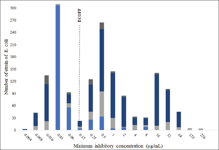 Fig. 1. Enrofloxacin MIC distribution for the 1734 E. coli strains isolated from broilers. The dotted line represents the ECOFF of 0.125 µg/ml Pharmacokinetic analysis of enrofloxacin in broilersThe final pharmacokinetic model describing enrofloxacin disposition in broiler plasma was identified as a two-compartment model with first-order absorption and linear elimination. The estimated population mean values for the pharmacokinetic parameters were as follows: absorption rate constant (Ka)=0.42 h−¹, clearance (Cl)=209.5 ml/kg/h, central volume of distribution (V1)=785.5 ml/kg, intercompartmental clearance (Q)=1647.5 ml/kg/h, and peripheral volume of distribution (V2)=3234.7 ml/kg. The model included the correlation between Ka, Cl, and V2, with bioavailability fixed at 87% (Supplemental Table S3). The results of the bootstrap analysis (n=1000 replicates) showed narrow 95% confidence intervals and confirmed the parameter estimates’ reliability and robustness (Table 1). Low levels of shrinkage (<20%) indicated sufficient data support for the estimation of random effects. Table 1. Pharmacokinetic model estimates and bootstrap results for enrofloxacin after intravenous and oral administration at a dose of 10 mg/kg body weight.