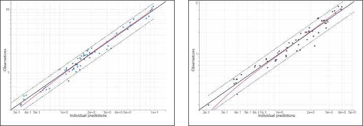 Fig. 2. Observed versus individual predictions. The blue dots indicate the intravenous data (left), and the gray dots indicate the oral data (right).